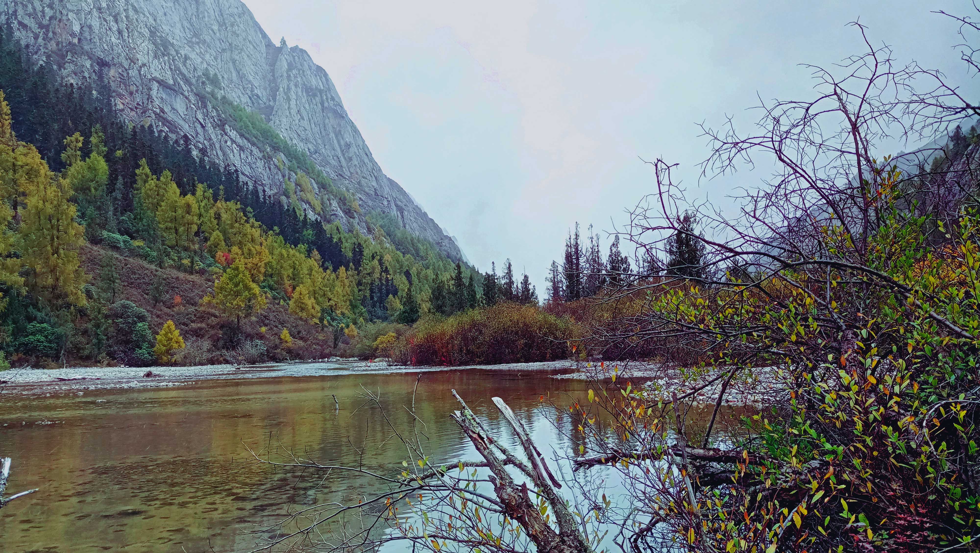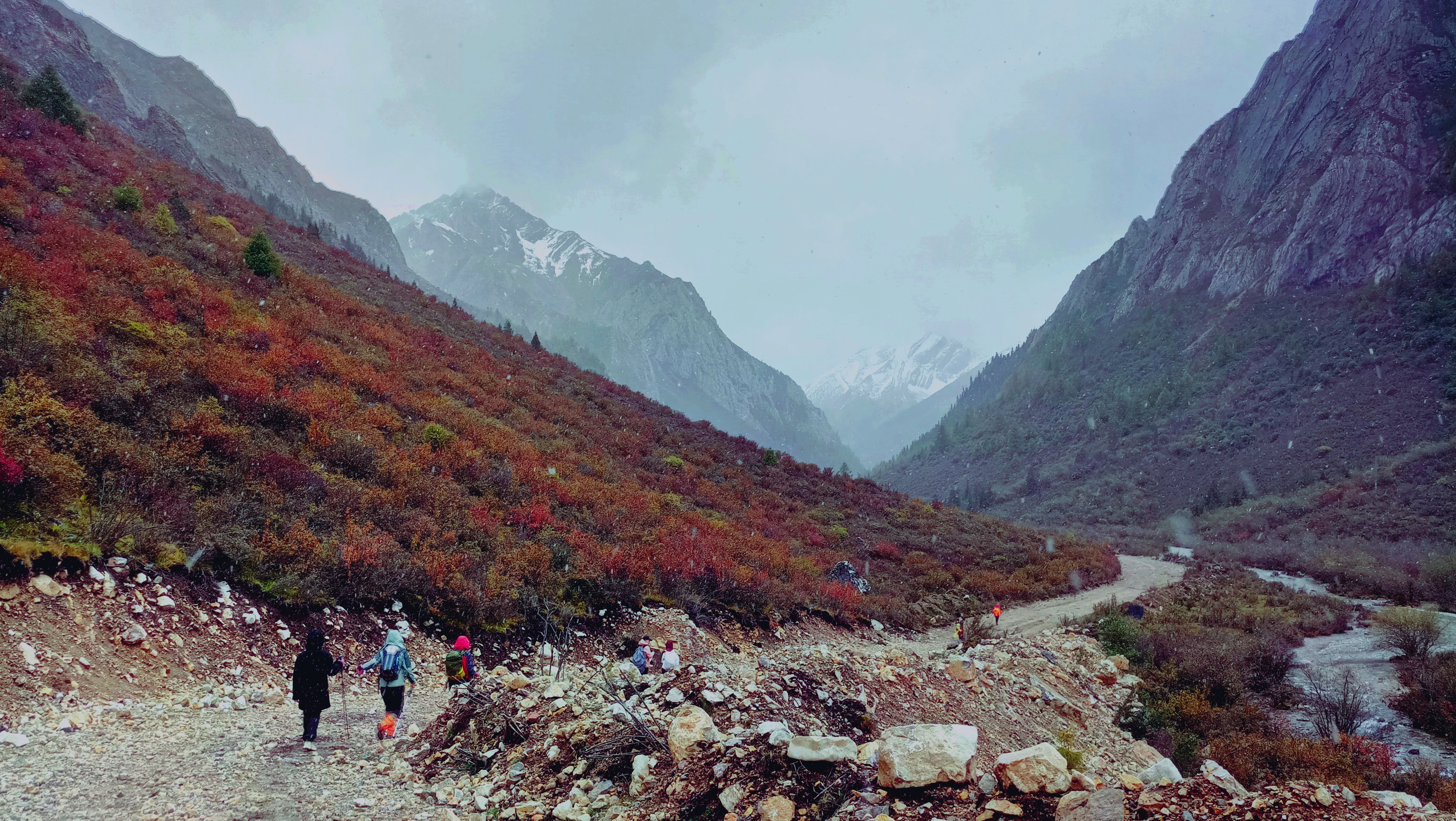 2018年10月1日早上我们出发进沟,15个人的队伍分成了前队,大葱、超梅、红领巾、小辛、时刻、刘亚、背包在前面,我还有妮子、Tina、旅鸽、张妮、欢歌为中队,大成(领队)、星辰、为后队。我紧跟在妮子的身边,海拔的缘故,体能的消耗是平时的两倍。妮子也是第一次走高海拔徒步,妮子是个徒步还没毕业的小新手,第一次是跟我去走七姑娘的溯溪线,在冰凉的溪水里泡了一天。她的体能是领队一直担心,出发前领队总担心她走不了。事实也是,她的体力也随着海拔的逐步升高,越来越差,她的背影已经显得是多么的孤独,离队伍从五分钟,到十分钟,三十分钟的落在了后面。我也没经历过高反,我从不理解这是一种怎样的感受。一路上雪花一直打在我的冲锋衣上,雪花落在地上很快的就化了,我还在拿着手机记录着VLOG,也跟随在妮子的身边,生怕她走着走着就停住不愿意走下去了,这毕竟只是我们徒步的第一天。人体力消耗到了极限,会出现跟自己的撞车。有的人会哭,会闹,有的人甚至会崩溃了。看着她的背影其实我其实是很担心她也会到极限,我怕自己应付不过来,我对哭闹的女生没扯,也不擅长安慰别人。随着她的步伐,慢慢的我们离营地越来越近,我们第一天的路程也接近了尾声,在营地里我暗暗的松了一口气。妮子走完了第一段路,我也走完了。