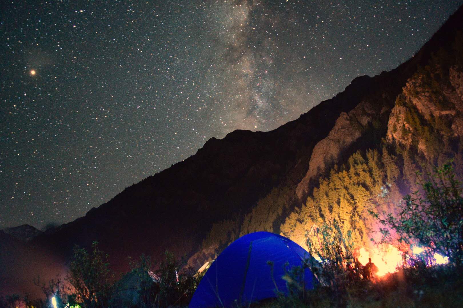 我没想到的是,高原的颜色比我预想中的还要丰富。走到时已经是下午五点多了,我按耐不住自己的激动,在看着这周边的山,看着一路同行的徒友。在夜幕下的帐篷与篝火是多么的美妙,在夜幕下的歌声是多么的动听。