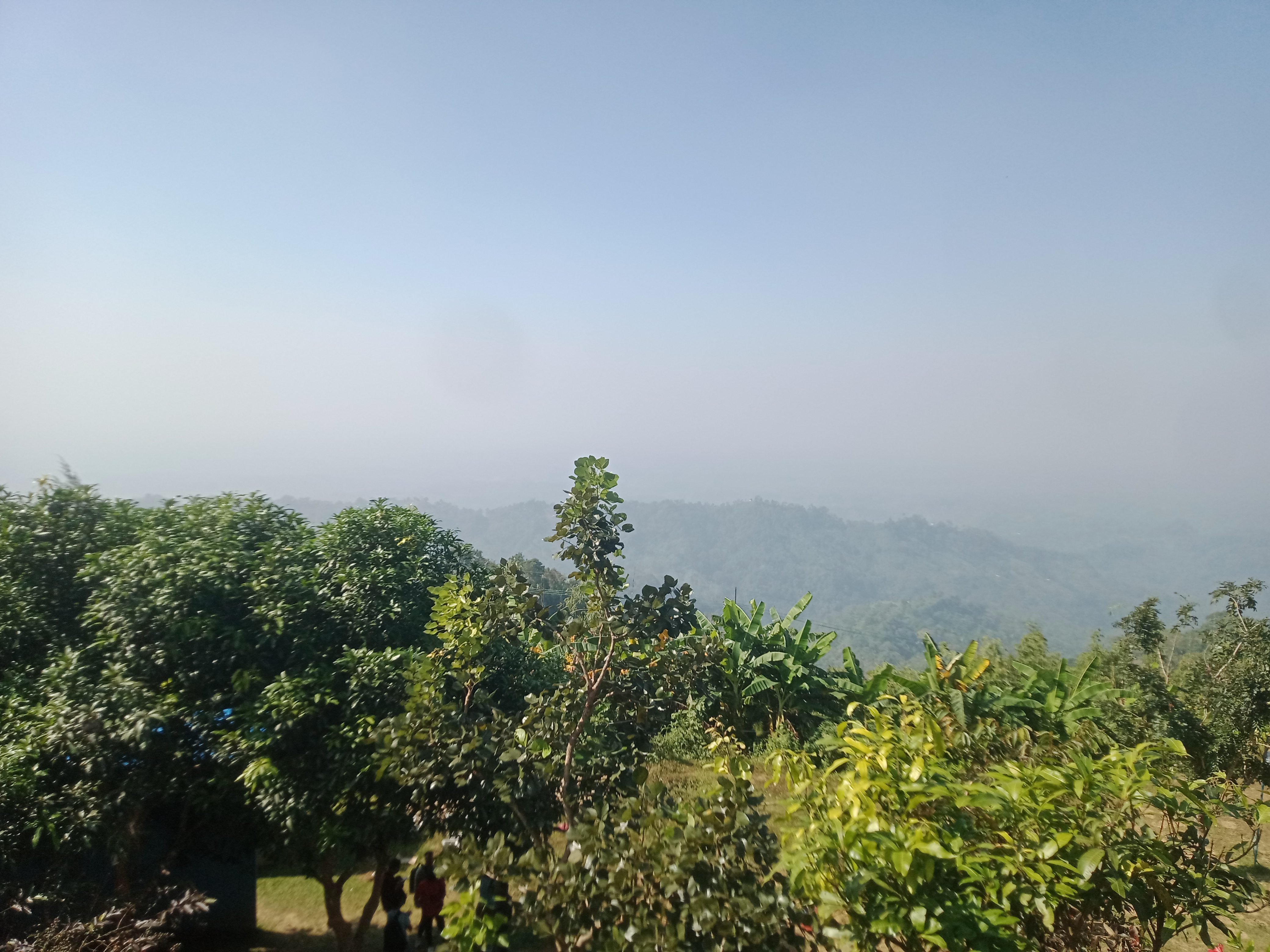 পাহাড়ে দেখলাম আনারসের চাষ হচ্ছে। রাস্তার পাশে আমগাছের তো অভাব নেই! যতদূর চোখ যায় শুধু পাহাড় আর পাহাড়। পাহাড়েও দেখলাম অনেক কলা গাছ। এই কলাগাছগুলো হয়তো প্রকৃতি প্রদত্ত। এগুলার নিজস্ব মালিকানা আছে কি না আমার সঠিক জানা নেই। তবে ক্ষুদ্র নৃগোষ্ঠীর মানুষগুলোর জীবিকা অনেকটাই পাহাড়কেন্দ্রিক। পাহাড়ে যা চাষ করে অথবা গাছে যে ফলমূল হয় সেগুলো বিক্রি করেই জীবিকা নির্বাহ করে। আমরা যতই যাচ্ছিলাম রাস্তা মনে হচ্ছিল শুধু বাড়ছেই! যাওয়ার পথে খেয়াল করলাম বেশ কিছু মহিলা যারা কাধেঁ করে কিছু নিয়ে যাচ্ছে। বই পুস্তকে পড়েছিলাম চাকমারা সাধারণত মাতৃতান্ত্রিক। মানে হচ্ছে পরিবারে মাই সব কাজ করে থাকে। তবে পুরুষ যে কিছু করে না ব্যাপারটা এমনও না। নীলগিরি যাওয়ার পথে বেশ কিছু স্পটের দেখা পেলাম। যাওয়ার পথে হাতের বামে দেখতে পেয়েছিলাম ডাবল হ্যান্ত ভিউ! তার সামনে আবার ছিল চিম্বুক পাহাড়। সেটা আবার একটু ভিতরে। কিন্তু আমাদের নীলগিরি পথ যেন পাচ্ছিলাম না।