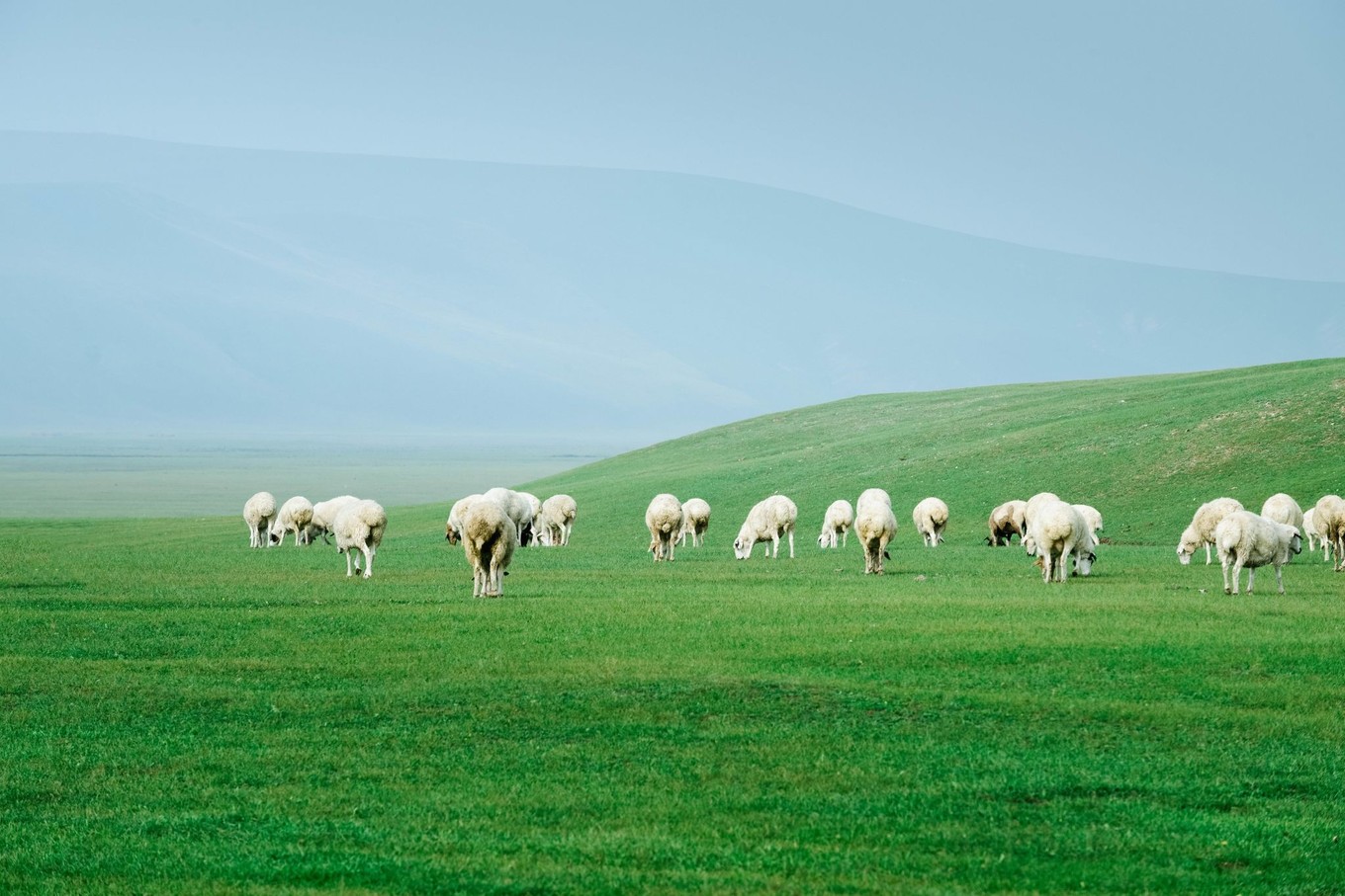 在绿草如茵的草地上,天空高高,乌云密布,土地辽阔,人口稀疏,牛羊静静地吃草和放牧,与人群保持距离。