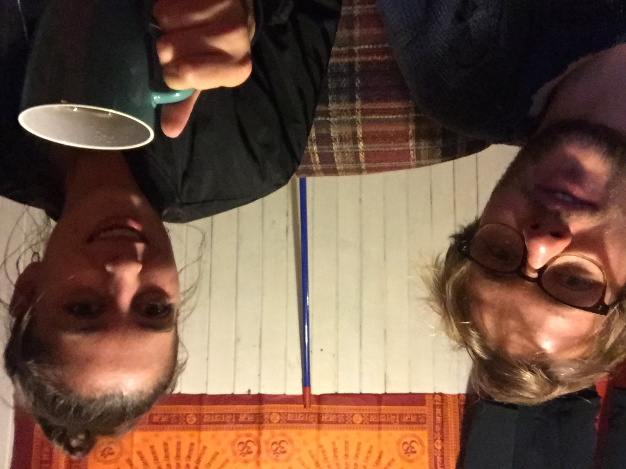 then we showered and sat down, before going to sleep, with a cup of tea in front of the fire in the stove.