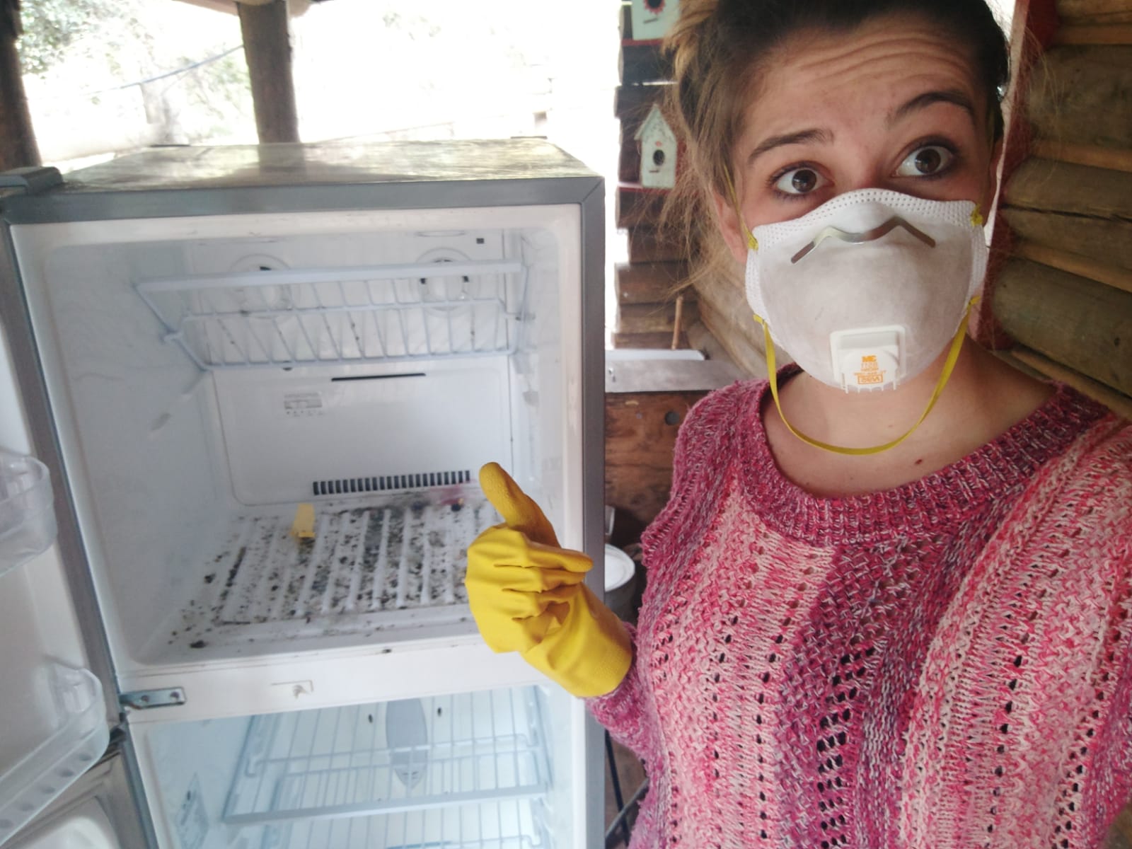 Juan and I began to split wood and lea began cleaning a refrigerator that was from the city's friend of Carina and was very dirty because it was not used.