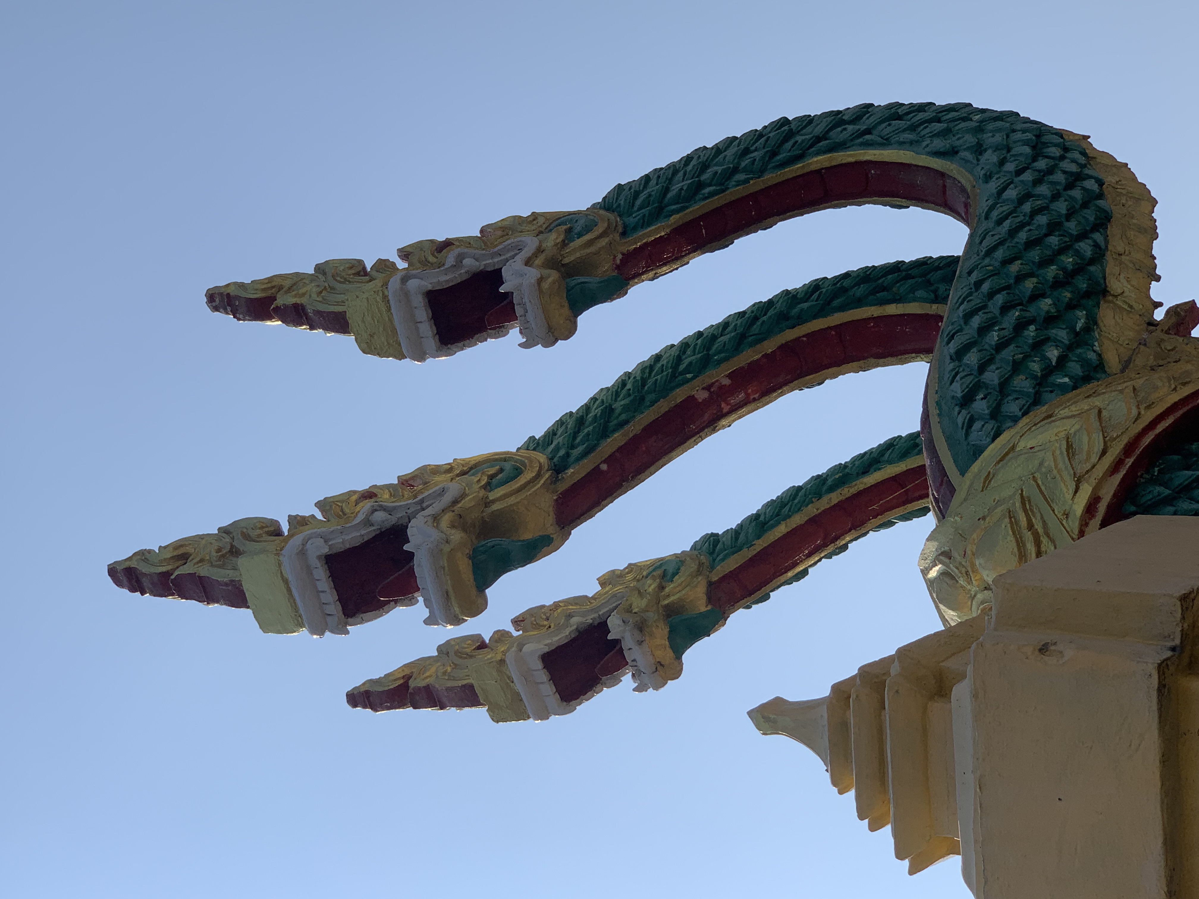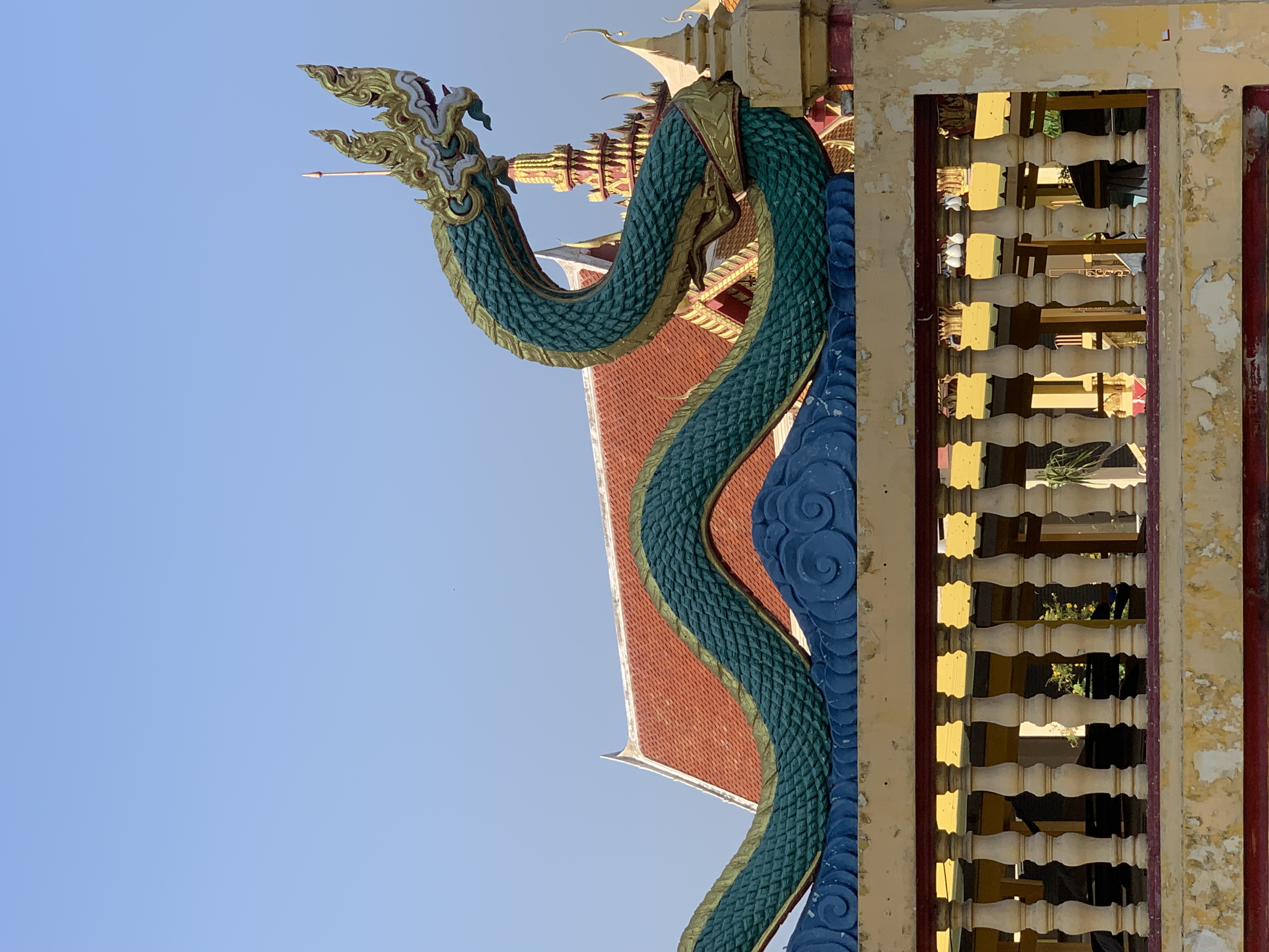 It’s the entrance that attracted my eyes and invited me to go inside the temple. The door is decorated beautifully with the four small majestic three-head Nagas with green bodies on the left and the right side. And another two bigger Nagas on both sides of the temple wall as well.