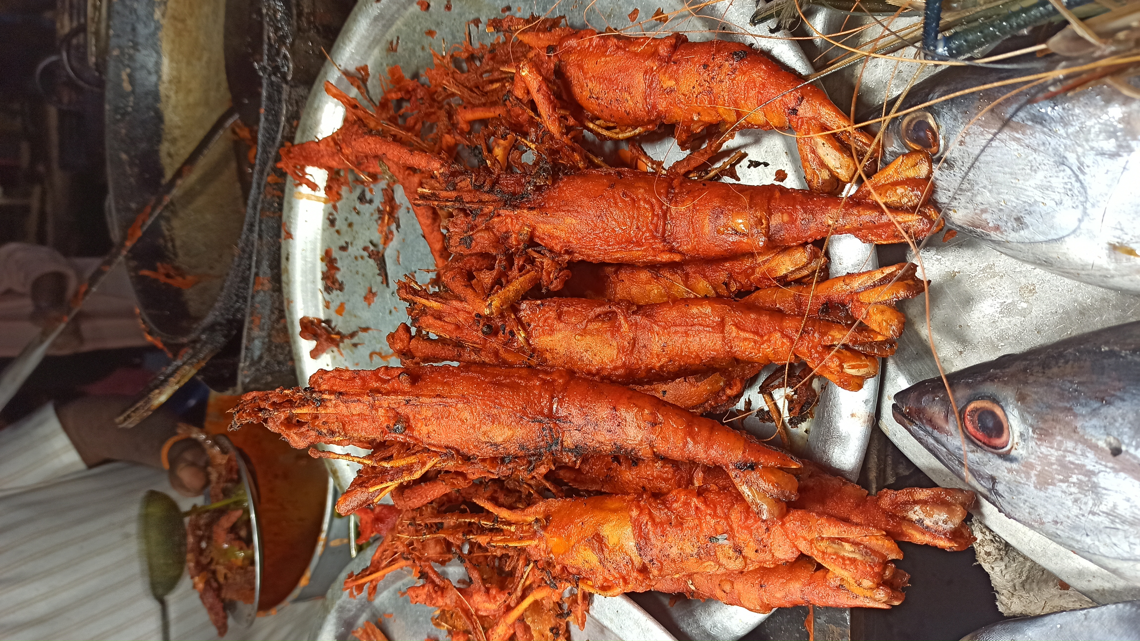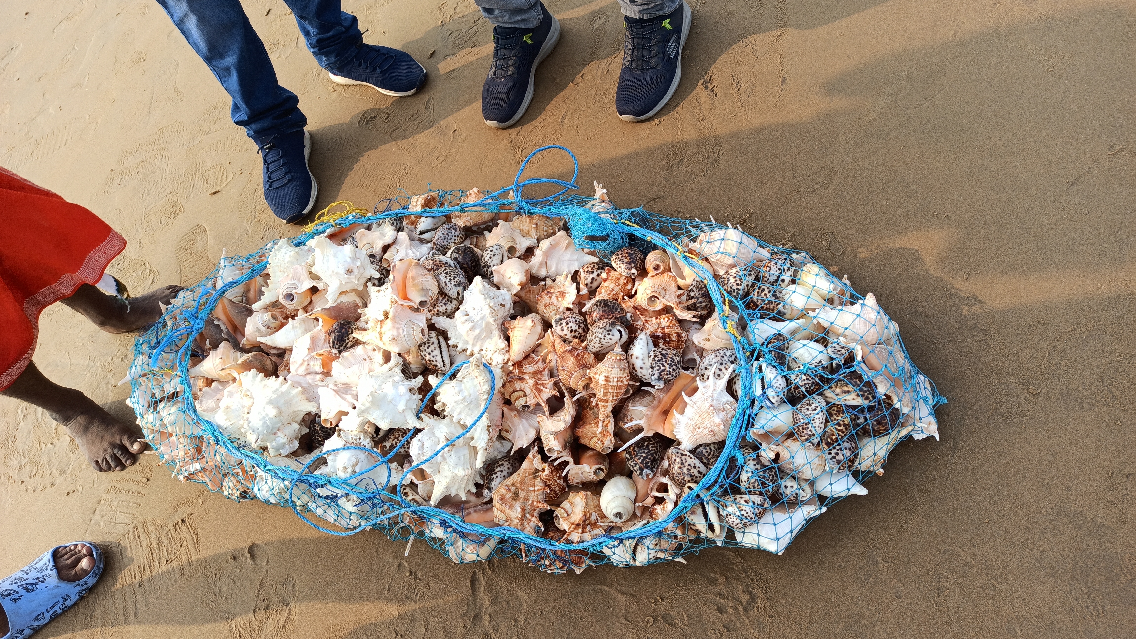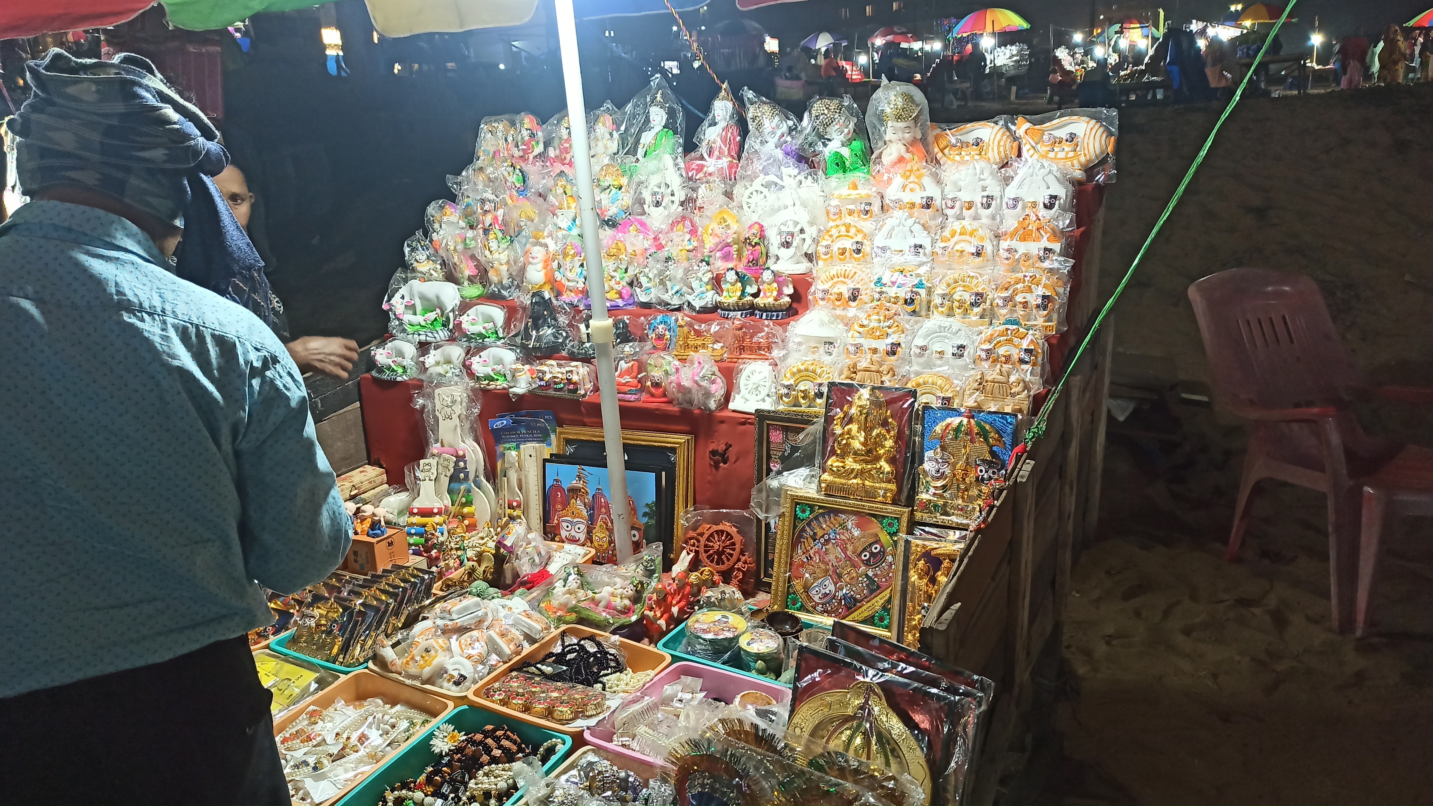 সমুদ্রের তীরে ছোট একটি জগন্নাথ দেবের মূর্তির দোকান, শামুকের দোকান ও মাছ ভাজার দোকান।