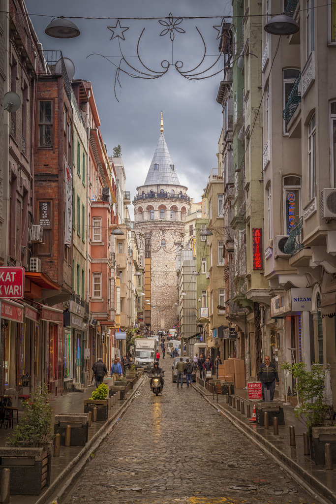 The Galata Tower (Galata Kulesi in Turkish) — called Christea Turris (the Tower of Christ in Latin) by the Genoese — is a medieval stone tower in the Galata/Karaköy quarter of Istanbul, Turkey, just to the north of the Golden Horn's junction with the Bosphorus. One of the city's most striking landmarks, it is a high, cone-capped cylinder that dominates the skyline and offers a panoramic vista of Istanbul's historic peninsula and its environs.