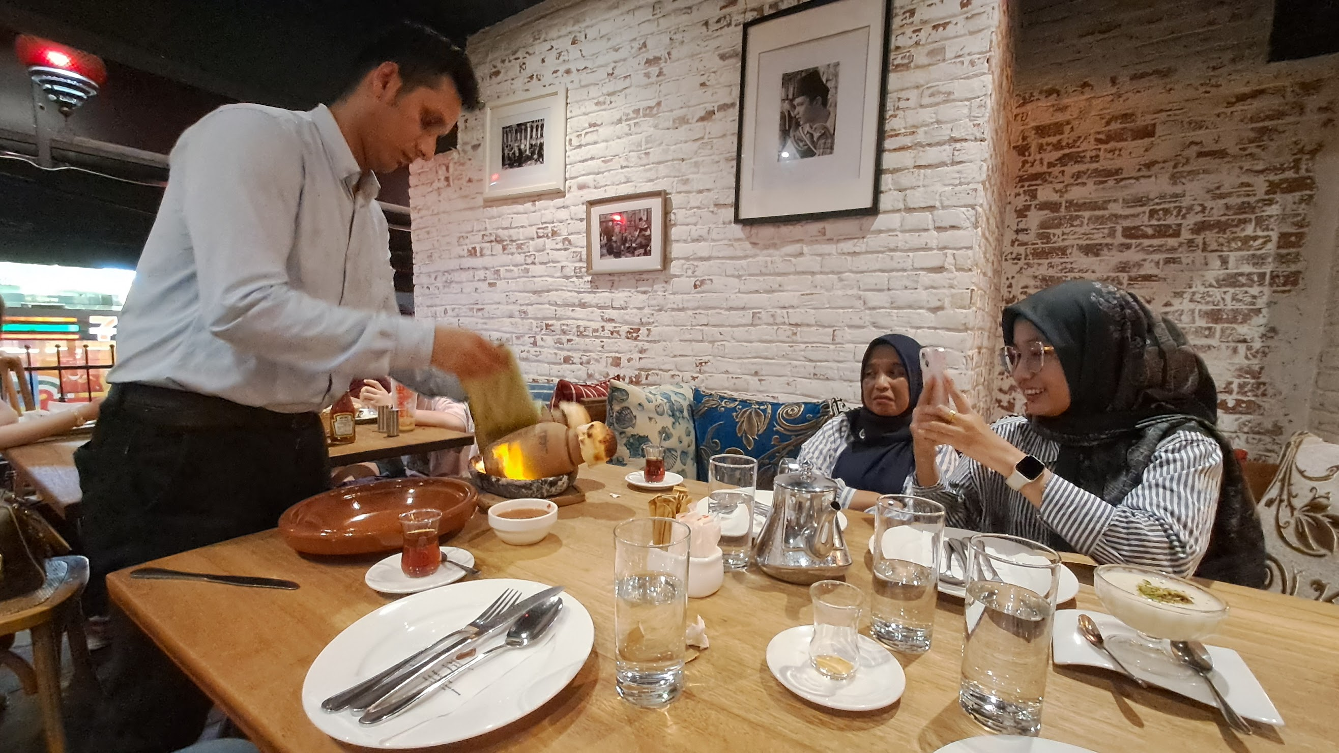 Saat saya tiba di sana bersama istri dan putri sulung saya, dia sudah berada di sana di antara ratusan pengunjung lain yang menunggu lampu untuk menyeberangi jalan. Di saat itu juga dia bilang, ayuk kita cari makan di sana. Saya pun kembali menyeberangi jalan yang saya lalui tadi terus masuk ke jalan yang lebih kecil yang dipenuhi rumah makan Arab dan India.