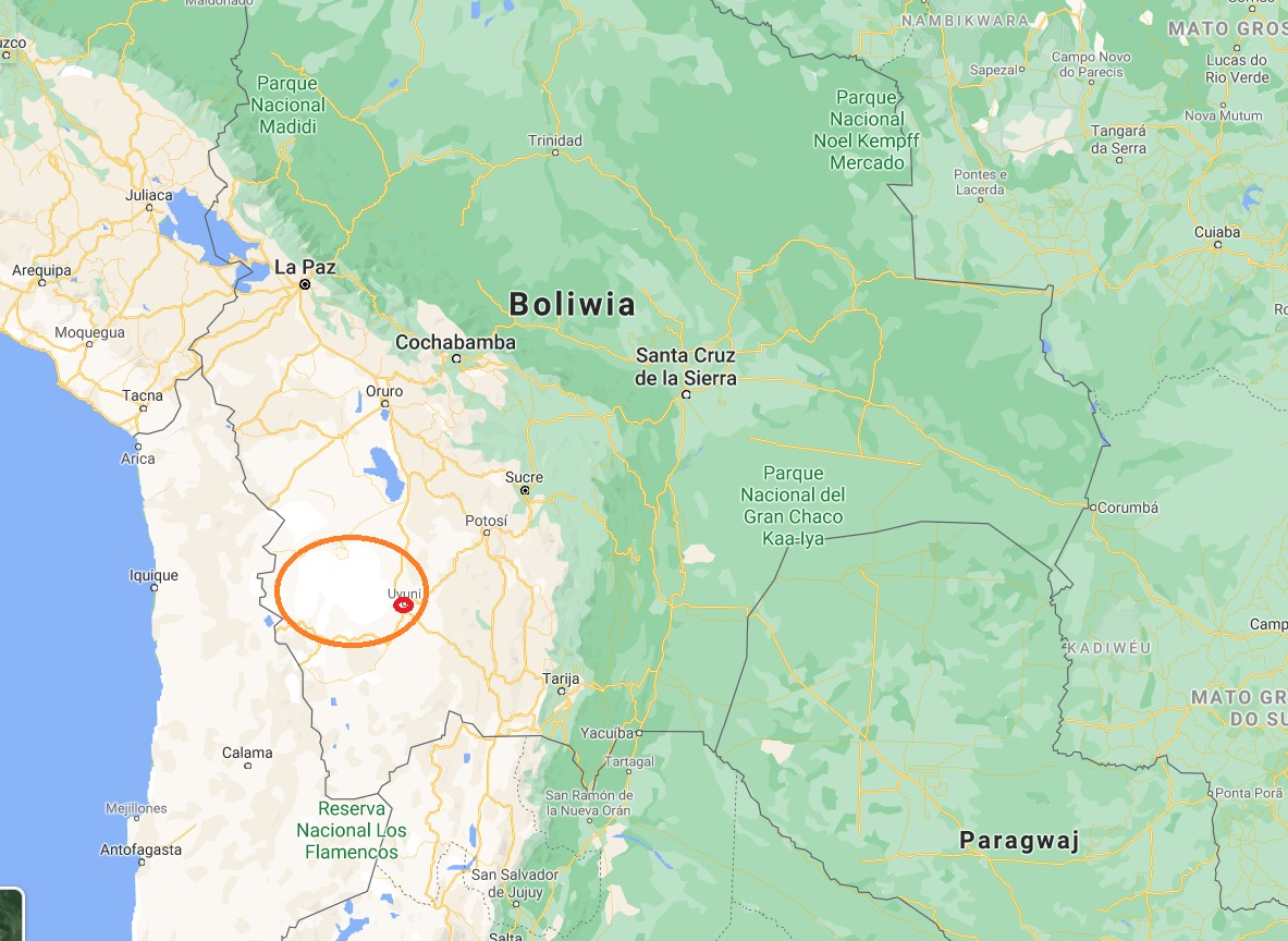 City Uyuni was marked with the red circle, although as the article will describe whole Salar de Uyuni with it’s attractions, I aditionally marked it with orange circle.