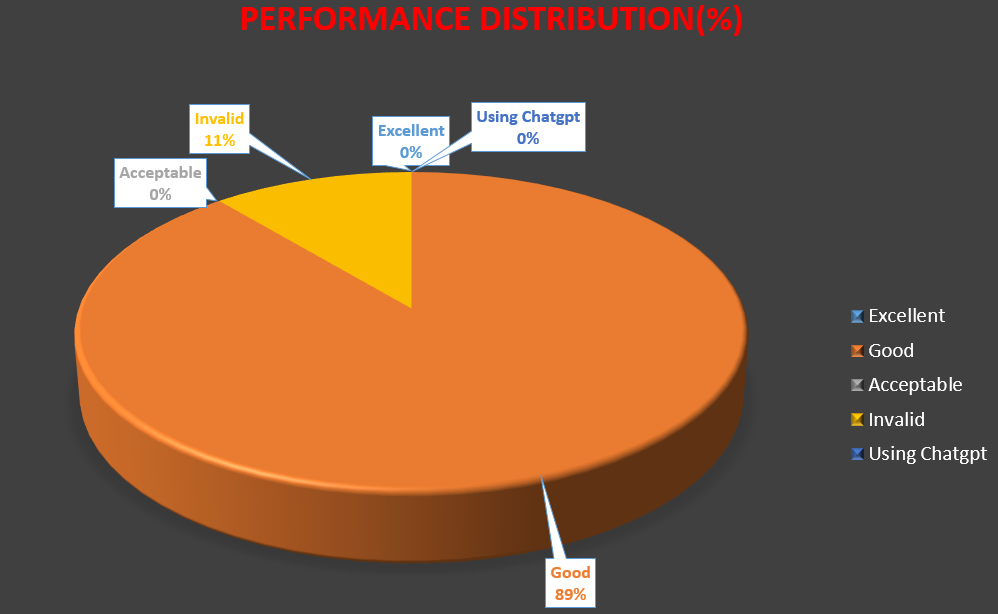 A significant number of entries, 89%, were rated as good quality. This demonstrates the participants’ in-depth understanding and analytical skills regarding the topic. A small number, 11%, were rated as invalid, indicating some non-compliance with the rules.