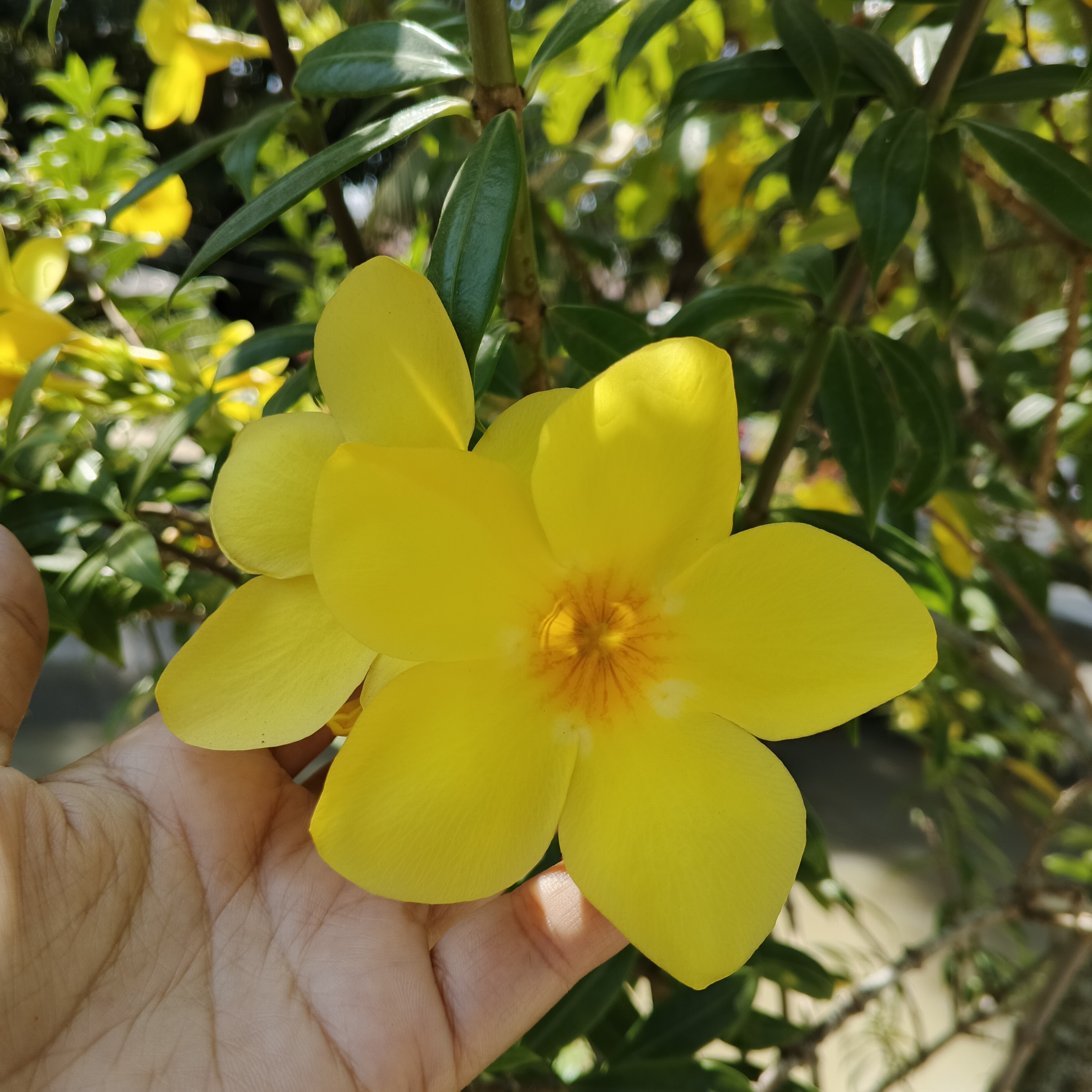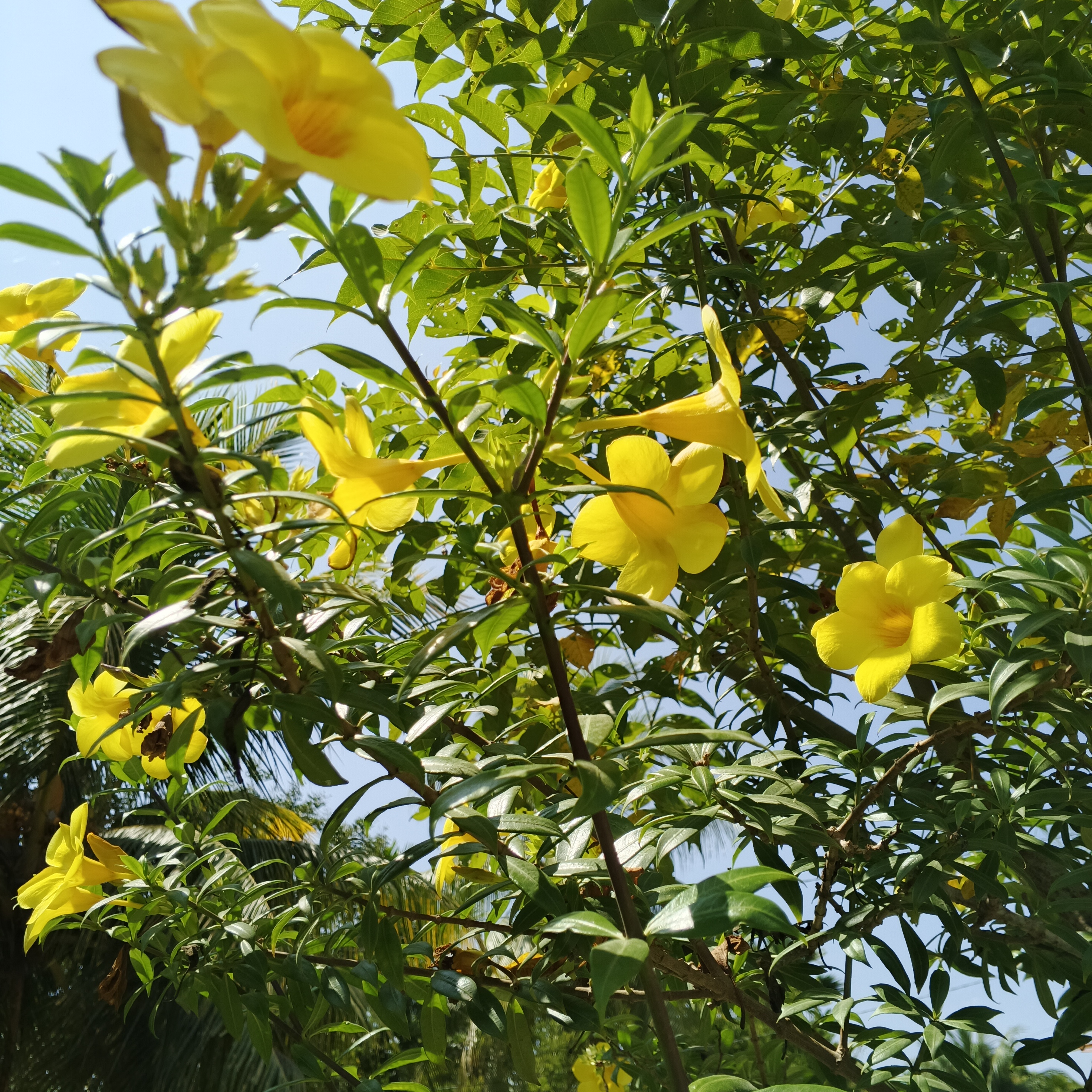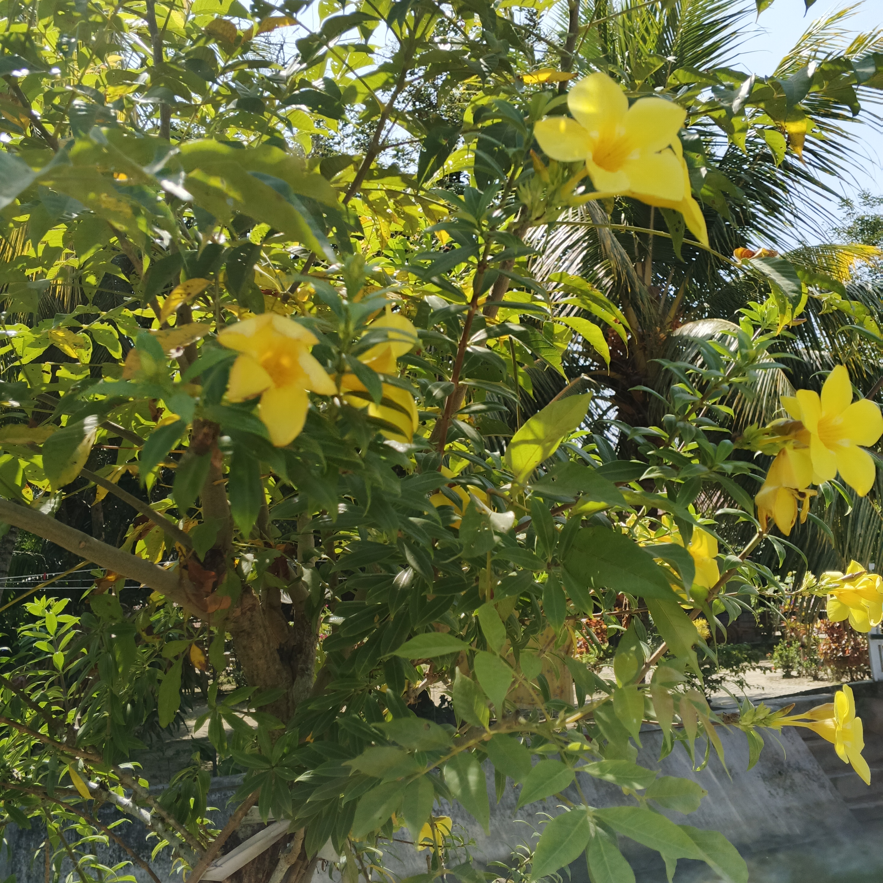 In the corner of my yard, there grows a group of flowers that always radiate joy, their color is bright yellow, as if they bring a piece of sunlight down to earth. These are the Alamanda flowers.