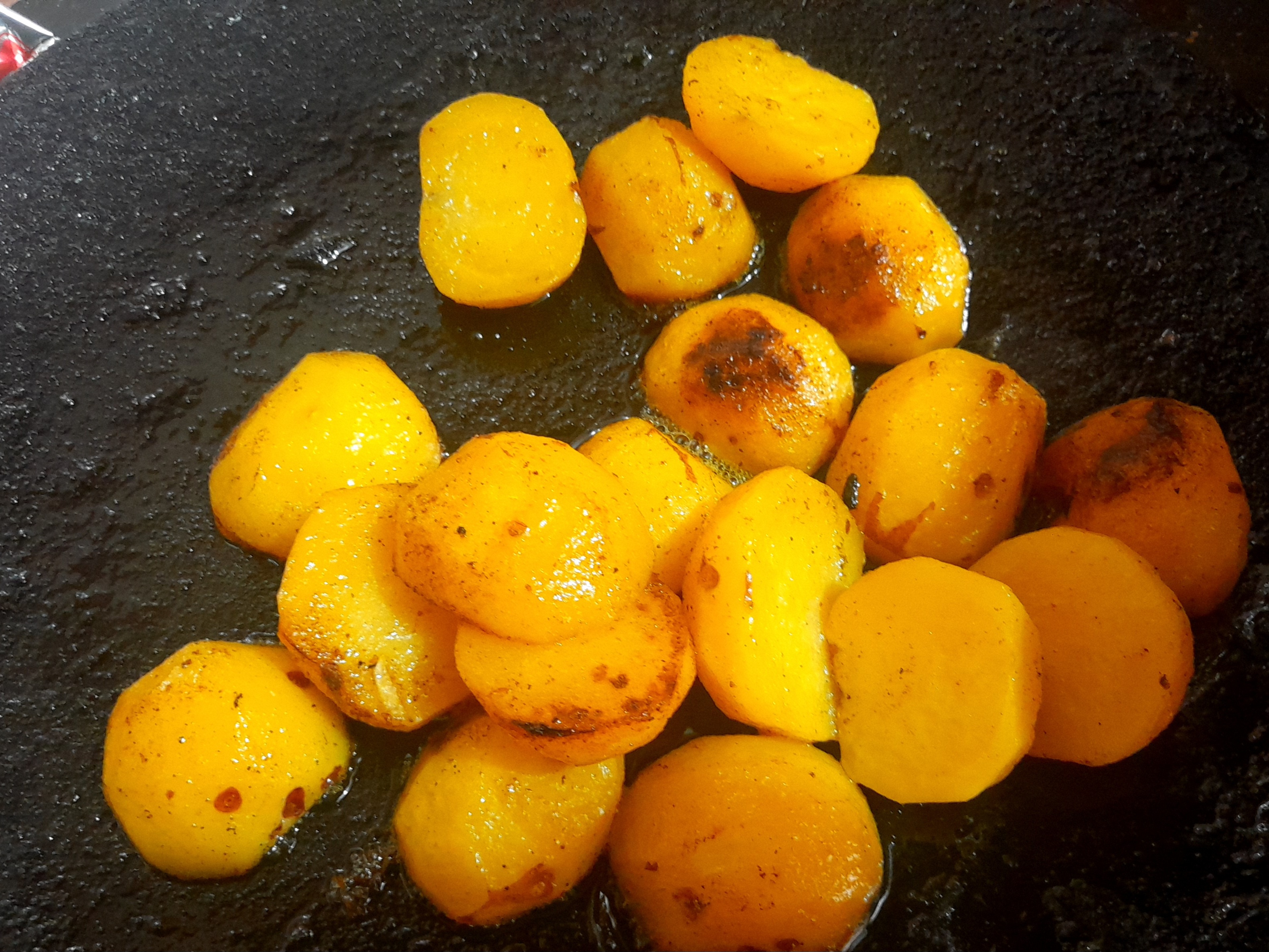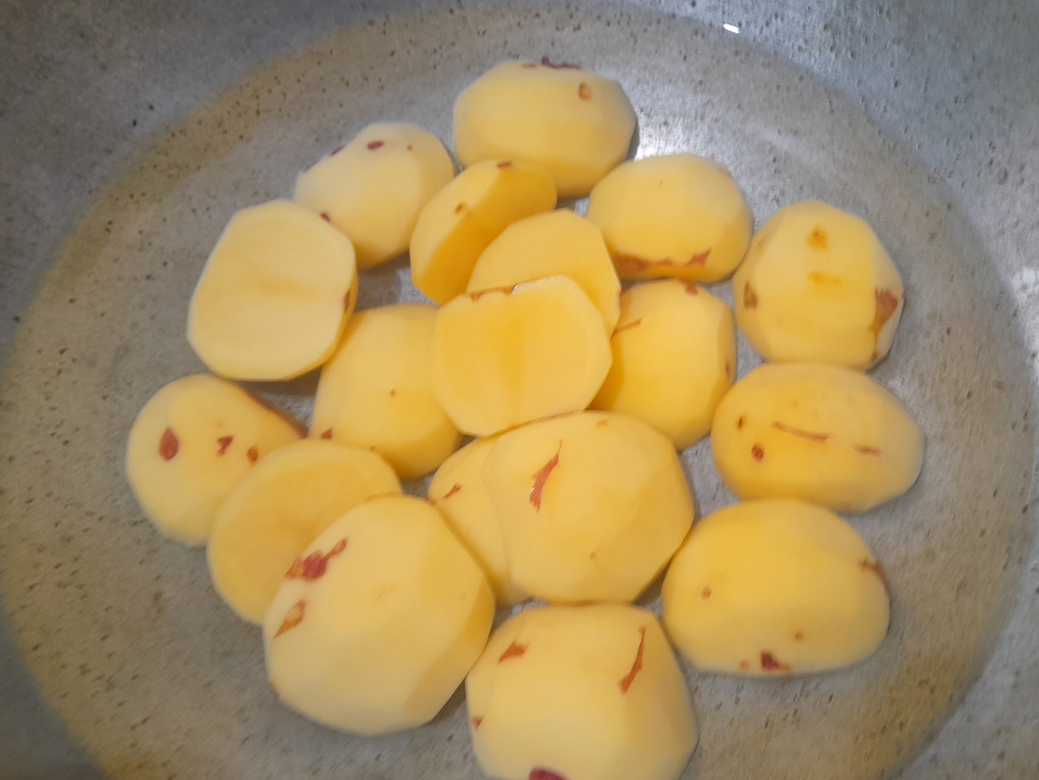 Then I peel the potatoes and cut. I mske two pieces of a potato because here I used smsll sized potatoes. Wash those very well and fry them at low flame for about 3-5 minutes.