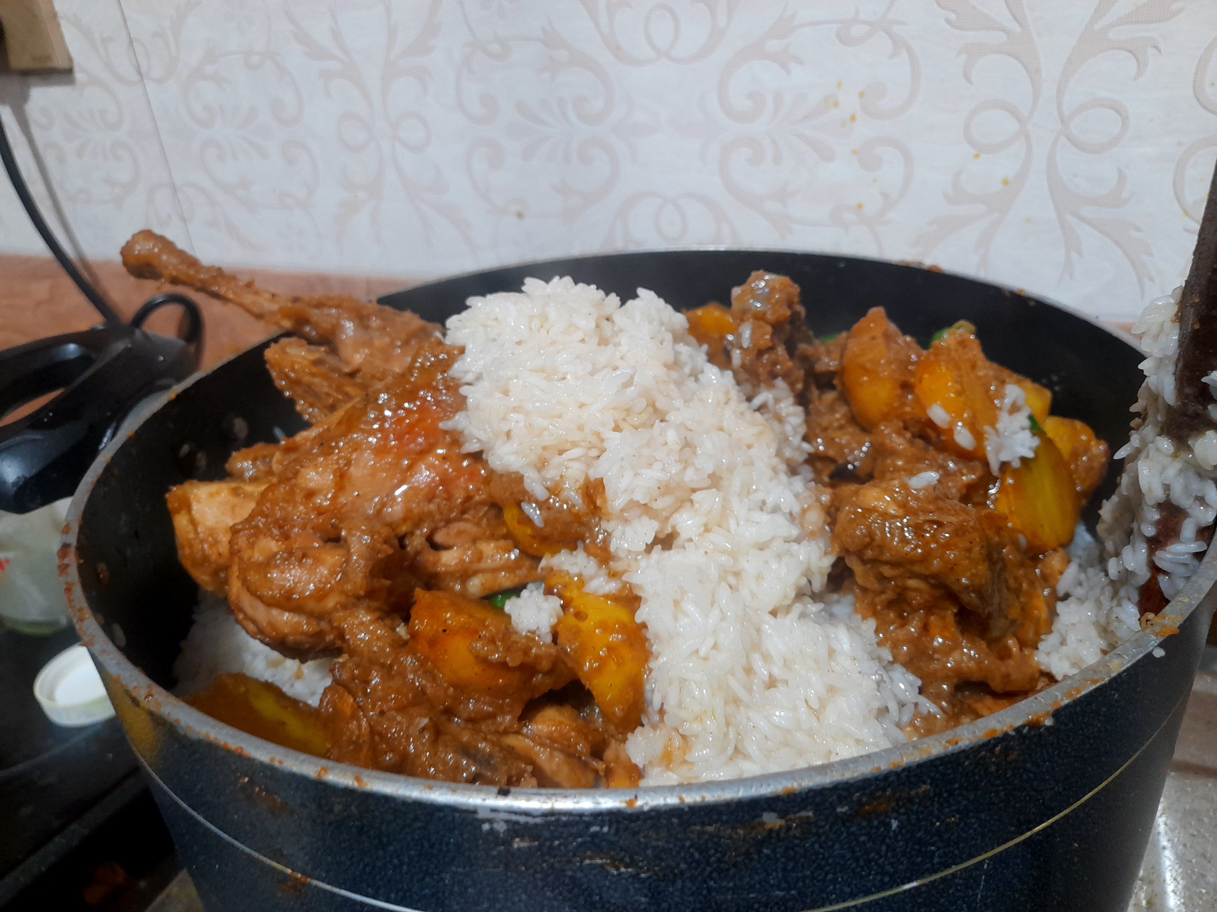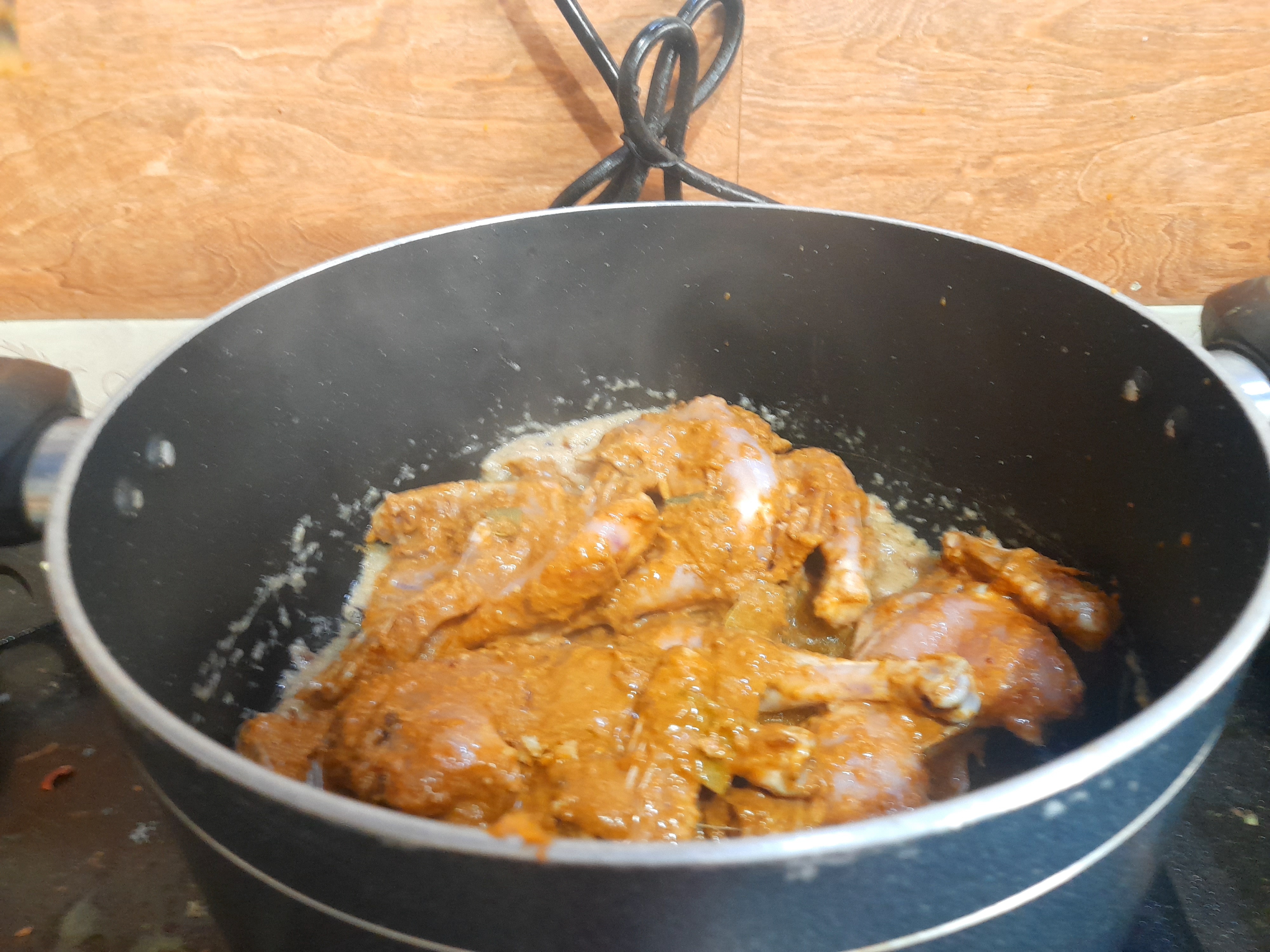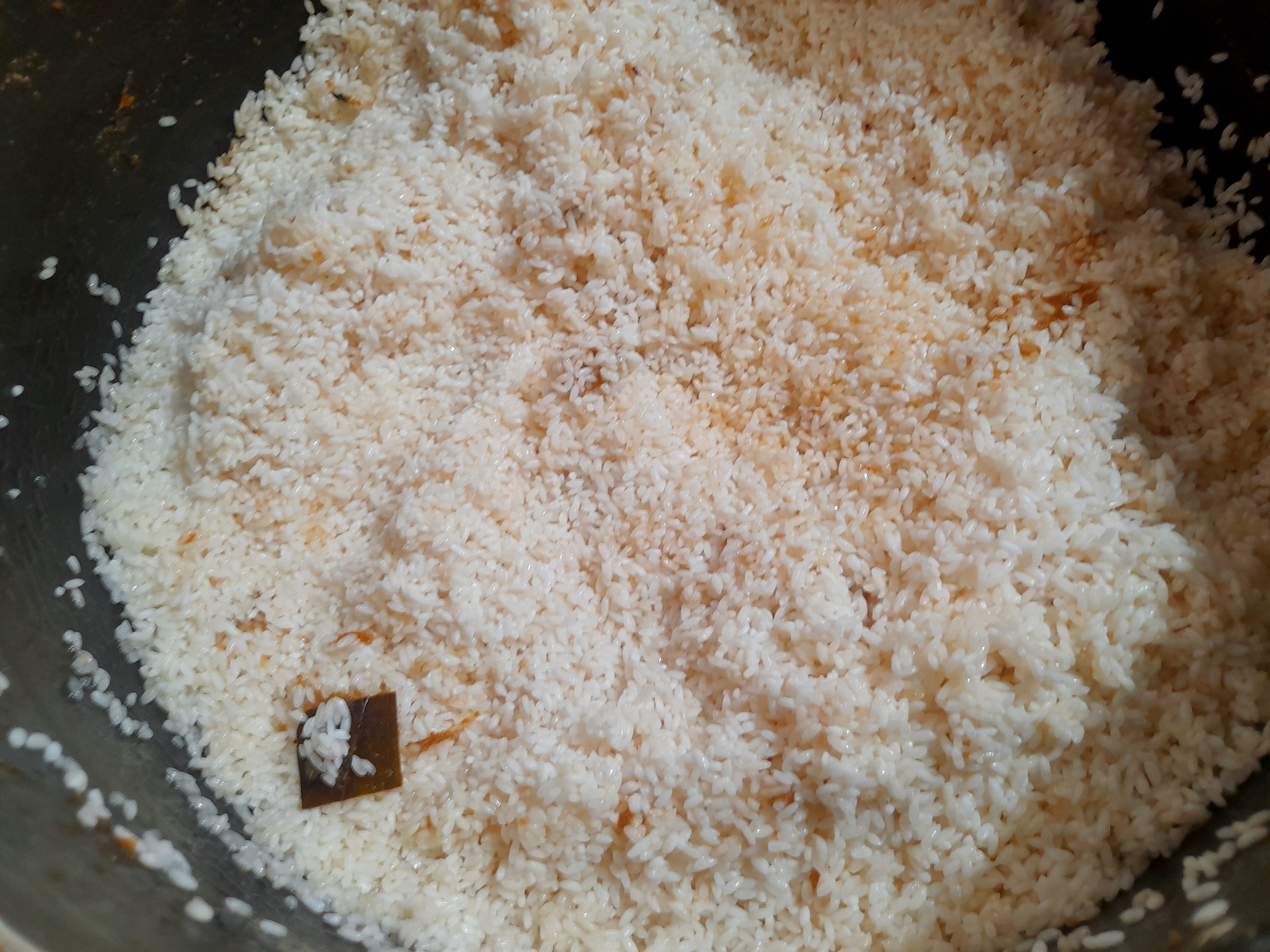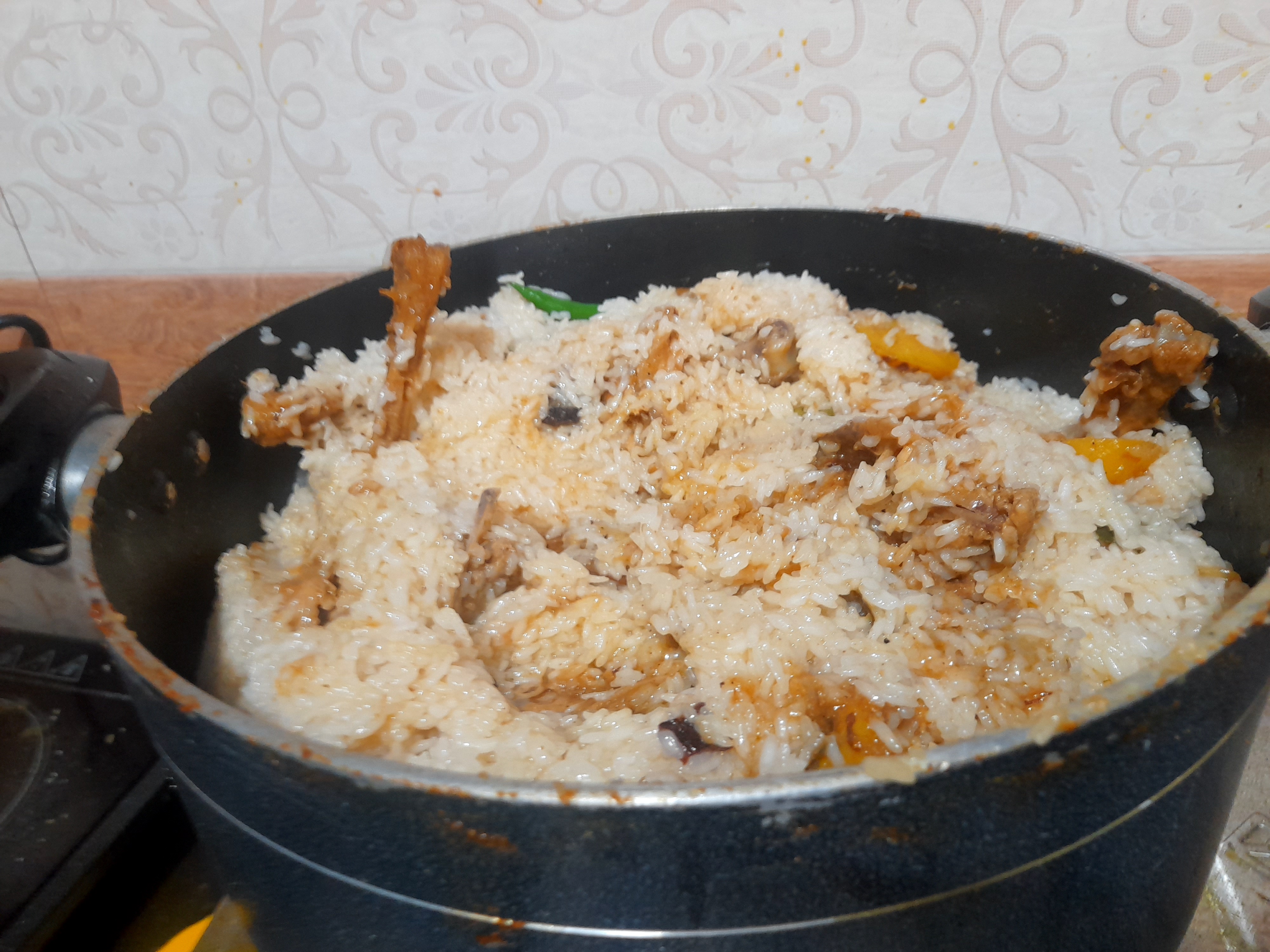 Once the rice is cooked, I reduce the heat, add the cooked chicken, and cover and leave it airtight for 10-15 minutes.
