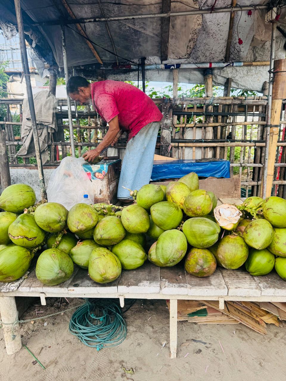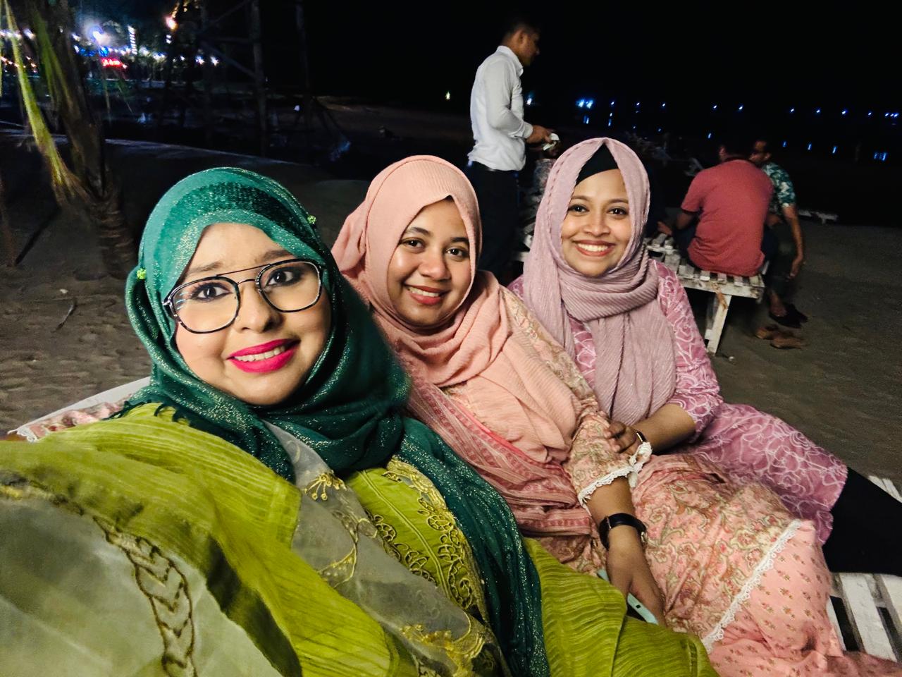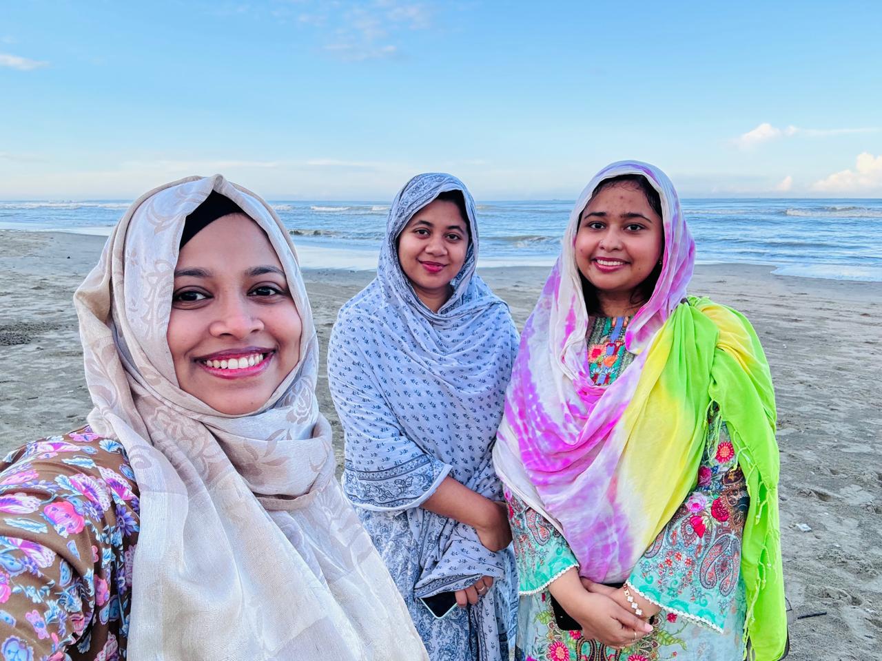 We arrived in Cox’s Bazar the previous evening. We mostly had just this one day to roam around, so we filled the day with activities and memorable experiences , determined to make the most of every moment. We ladies woke up very early in the morning , as we wanted to enjoy the sunrise and the calming ambiance of the sea. Though we were a little tired , we managed to get up early and head to the beach , where we experienced a serene and beautiful morning sitting by the shore. It was an amazing experience, one I must acknowledge. While we were there, we enjoyed fresh, local green coconut water, which is a must when visiting Cox’s Bazar, and savored the fresh coconut flesh.