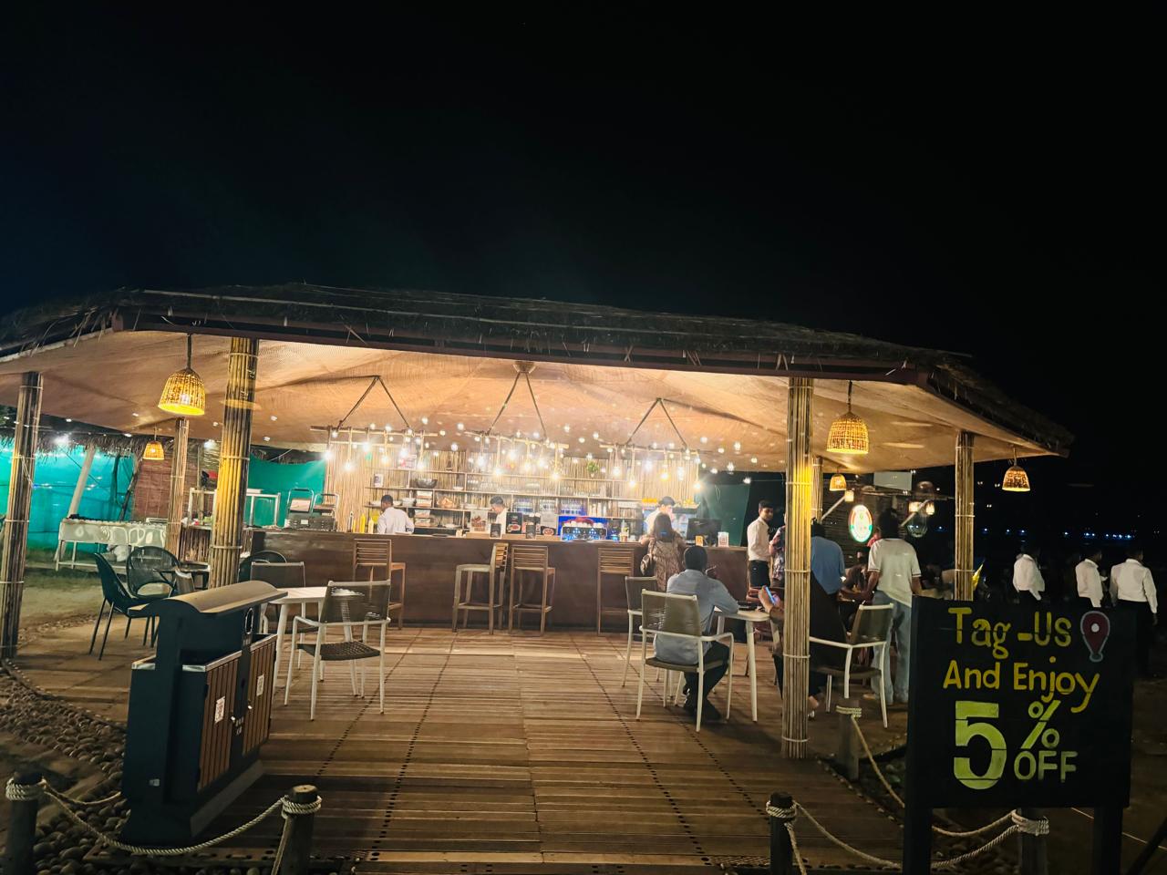 After spending the entire sunset time there, we moved to our final destination for the day: "Bay Watch." We went there to enjoy the night view of the sea. The place had beach facilities, and there was a snack arrangement as well. Since we and the kids were hungry, we sat in front of the beach and shared a meal together. As this was our last stop, we relaxed, spent a long time gossiping, and continued to enjoy the evening. The place was well-arranged, decorated with a beach theme, and picture-perfect with lots of cool spots, so visiting Bay Watch was absolutely worth it.