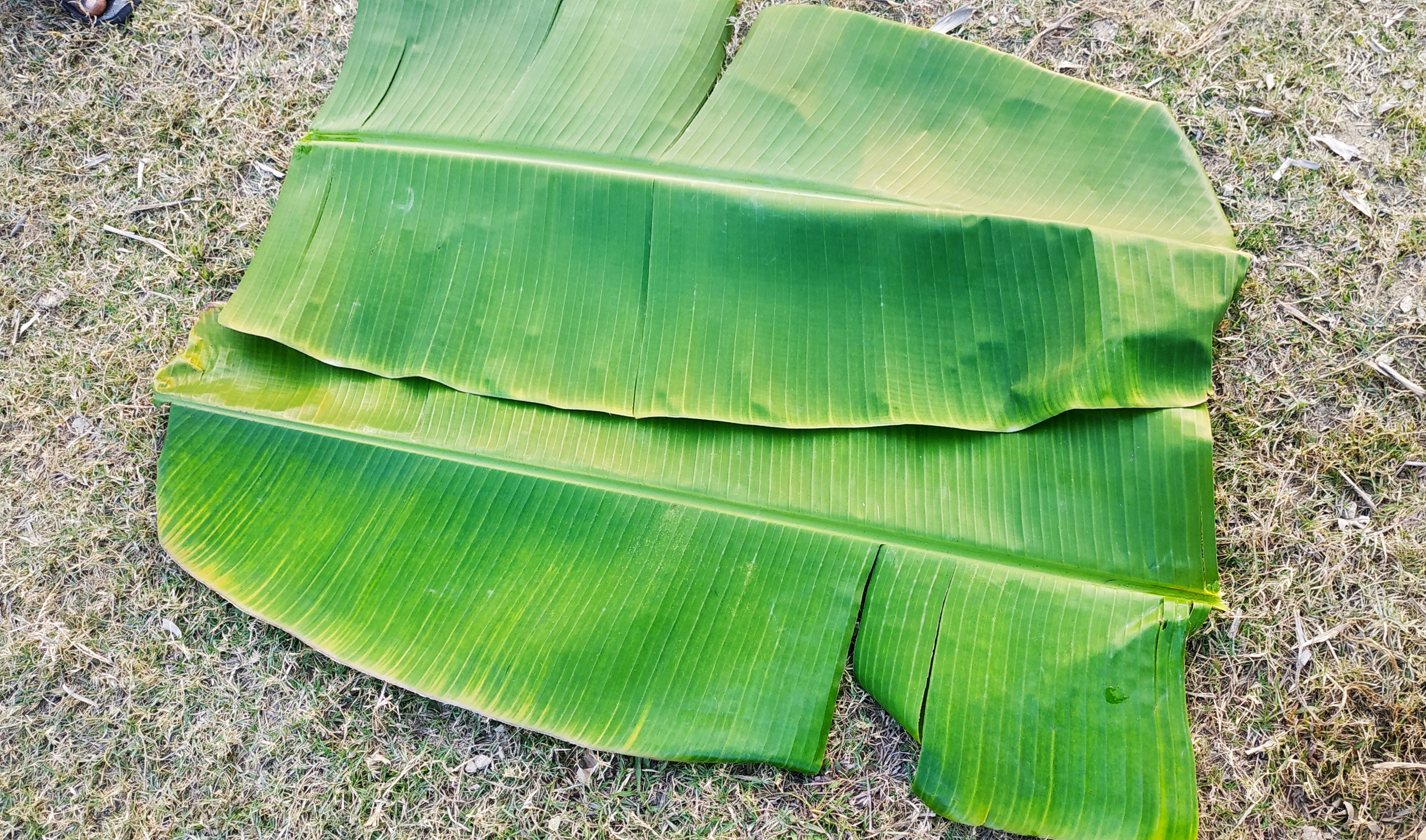 এরপরে দুইটা কলার পাতা কেটে মাটিতে বিছিয়ে নেই। এবং তার উপরে ফলগুলো ঢেলে দেই। |