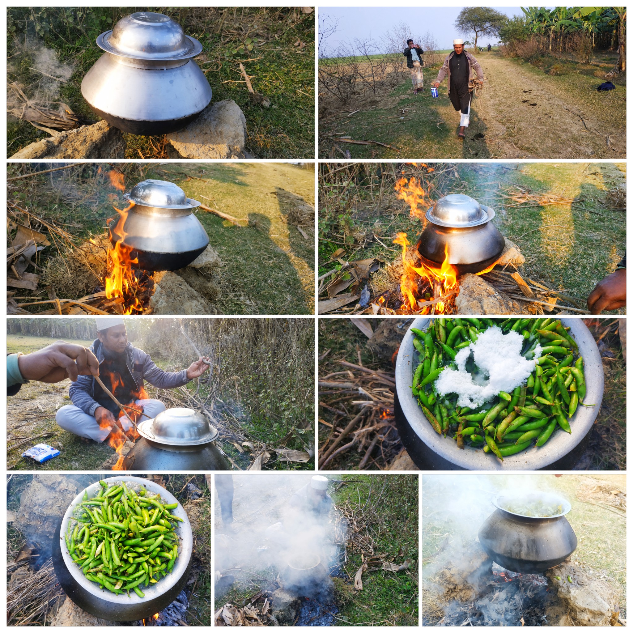 যখন আমাদের পর্যাপ্ত পরিমাণ ফল উঠানো শেষ হয় তারপরে আমরা একটি কলাবাগানের আবডালে আসি ।কারণ ঐদিন অনেক বাতাস হচ্ছিল। বাতাসের কারণে ফাঁকা জায়গায় চুলা জ্বালানো সম্ভব হচ্ছিল না। তাই কলার বাগানের পাশে এসে বড় বড় মাটির চাপ দিয়ে একটি চুলা তৈরি করি। এবং চুলার উপরে ফল সিদ্ধ করার জন্য পানি দিয়ে চুলার উপরে বসিয়ে দিই। এবং আশপাশ থেকে কিছু লাকরি ও কলার খোলা সংগ্রহ করি জ্বালানোর জন্য। এবার জ্বালানি সংগ্রহ করা শেষ হলে চুলায় আগুন দিয়ে জ্বালাতে থাকি। ফটোতে লক্ষ্য করলে দেখতে পাবেন। জ্বালানোর একপর্যায়ে যখন পানি ফুটতে থাকে তখন তার মধ্যে লবণ দিয়ে দেই। লবণ দেওয়ার পরে 15 মিনিট ধরে জ্বালাইতে থাি 15 মিনিট পর তখন ফলগুলো সিদ্ধ হয়ে গেছে। |