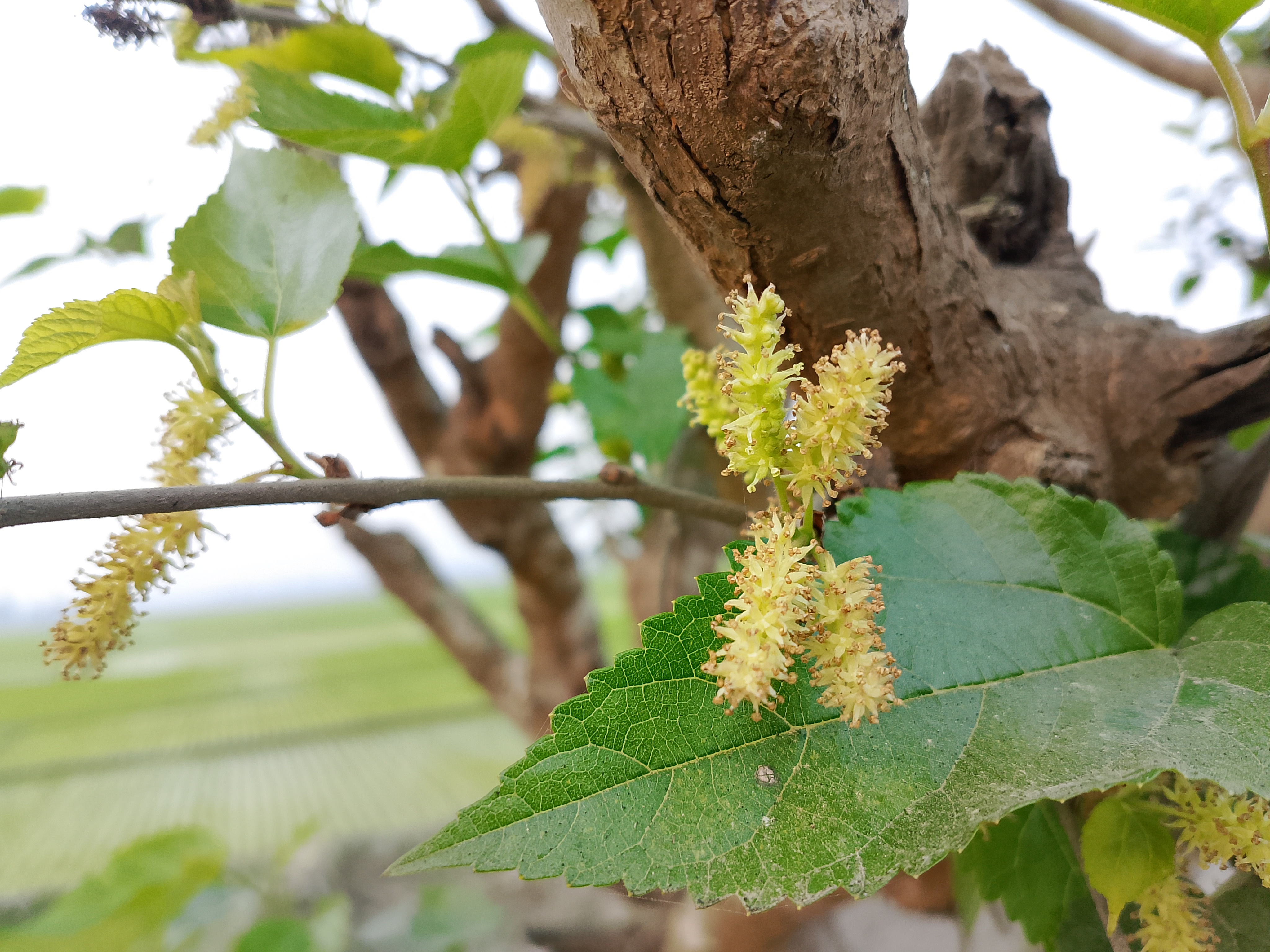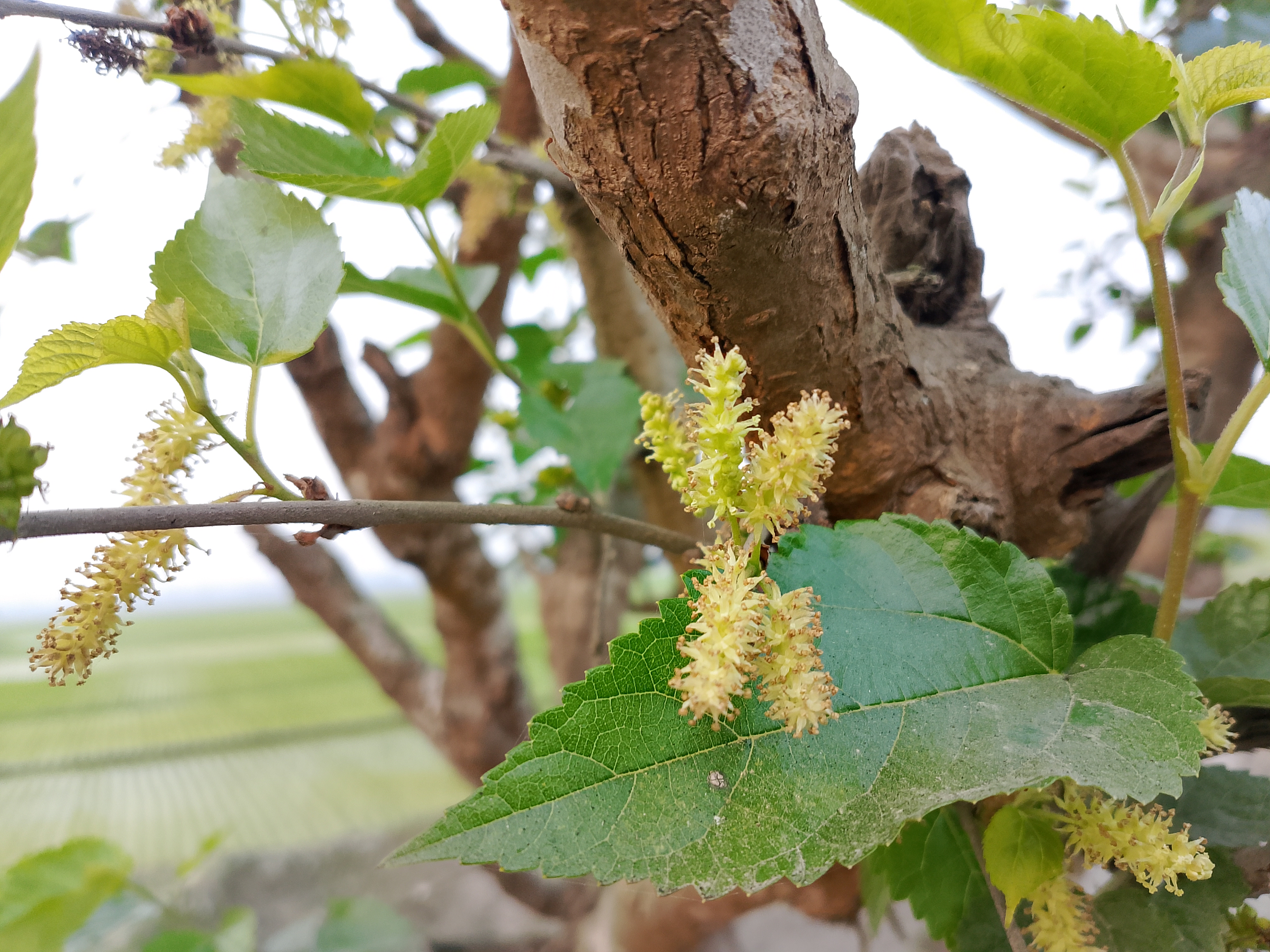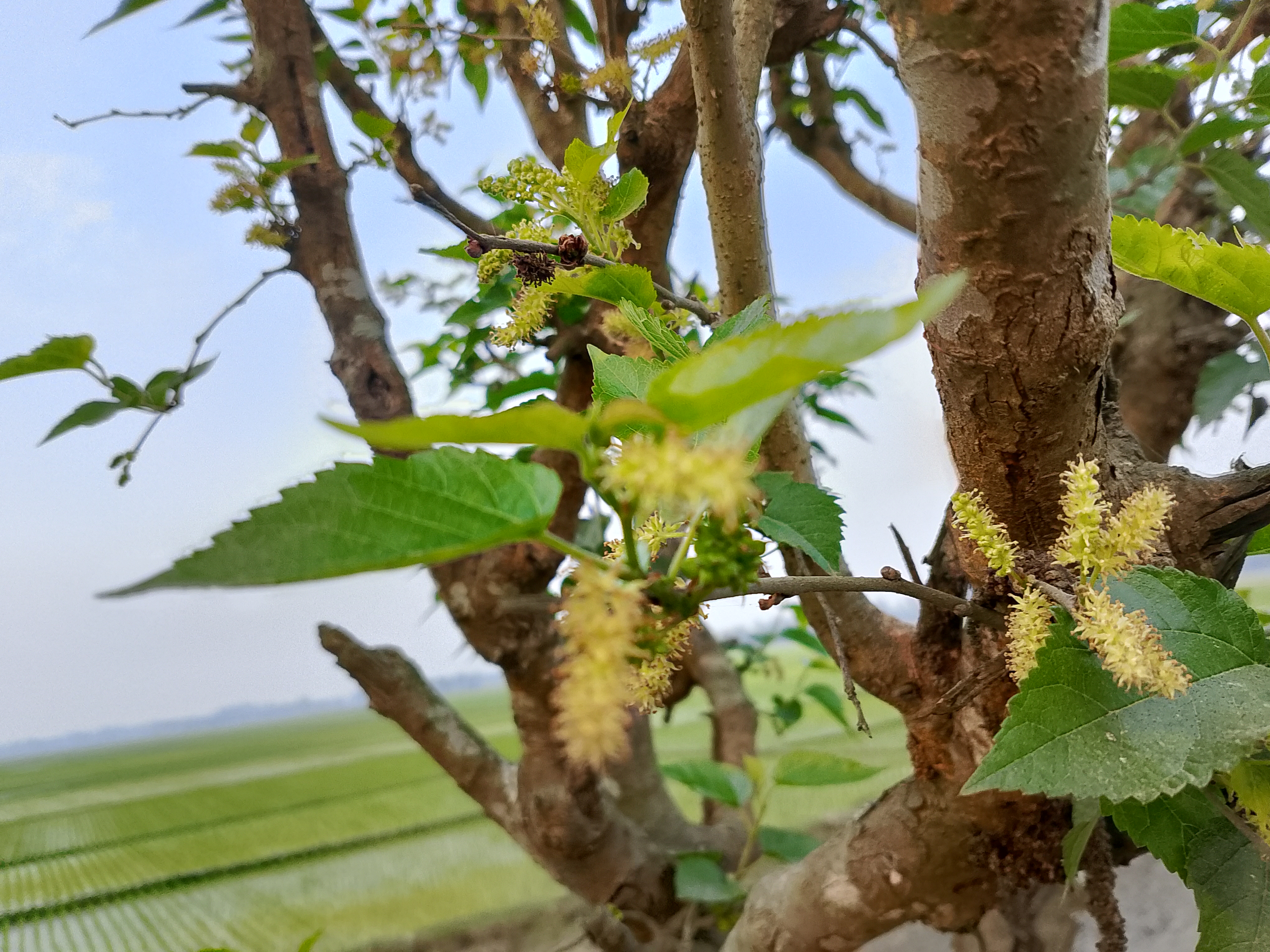 The mulberry tree grows quite tall, and its leaves are broad and flat. Today, we went to see a mulberry tree. When we tried to pick the fruit, we noticed that it was not yet ripe. At that moment, we realized that unripe mulberries are not edible. The fruit is long and slender, not thick.