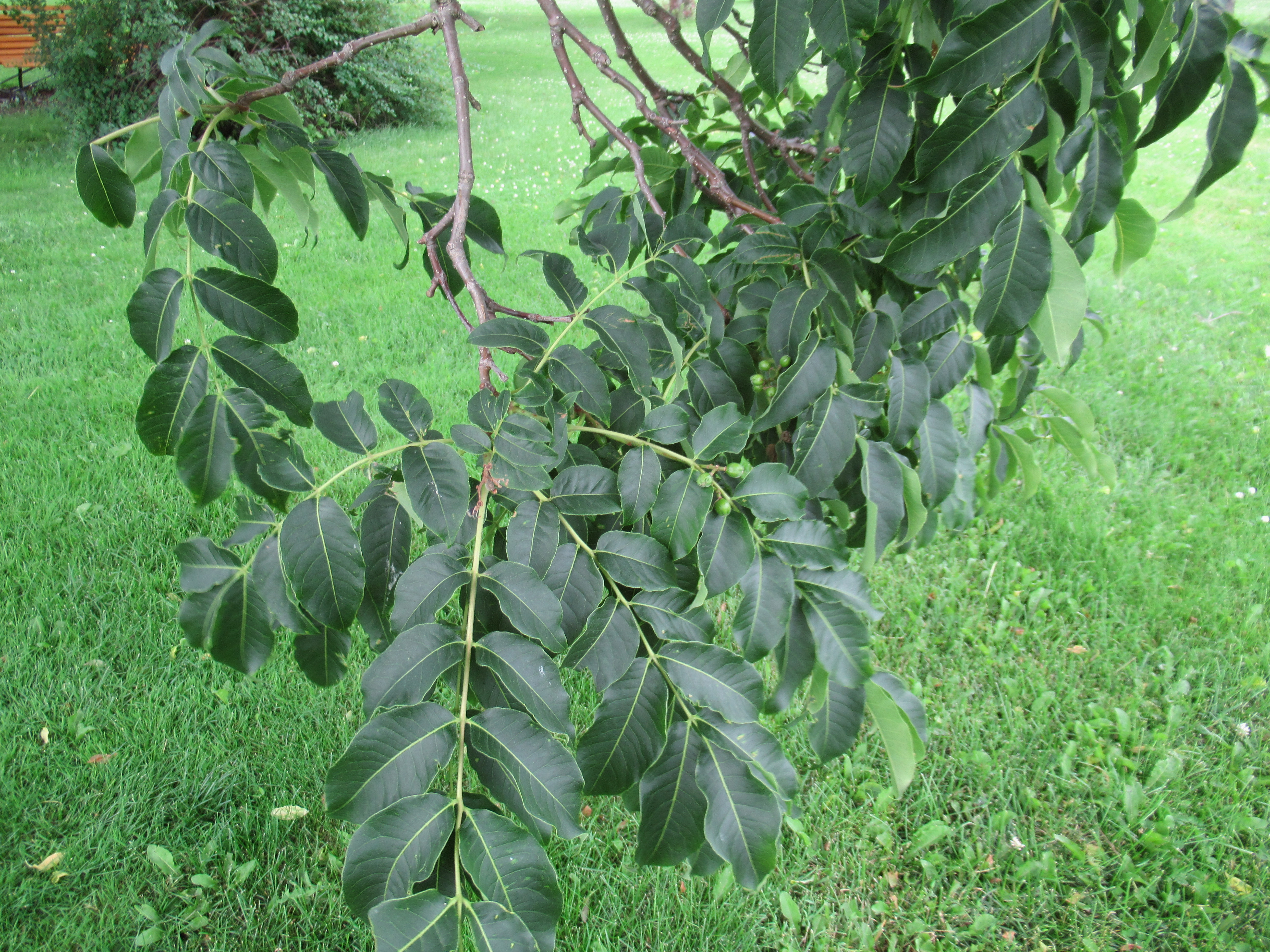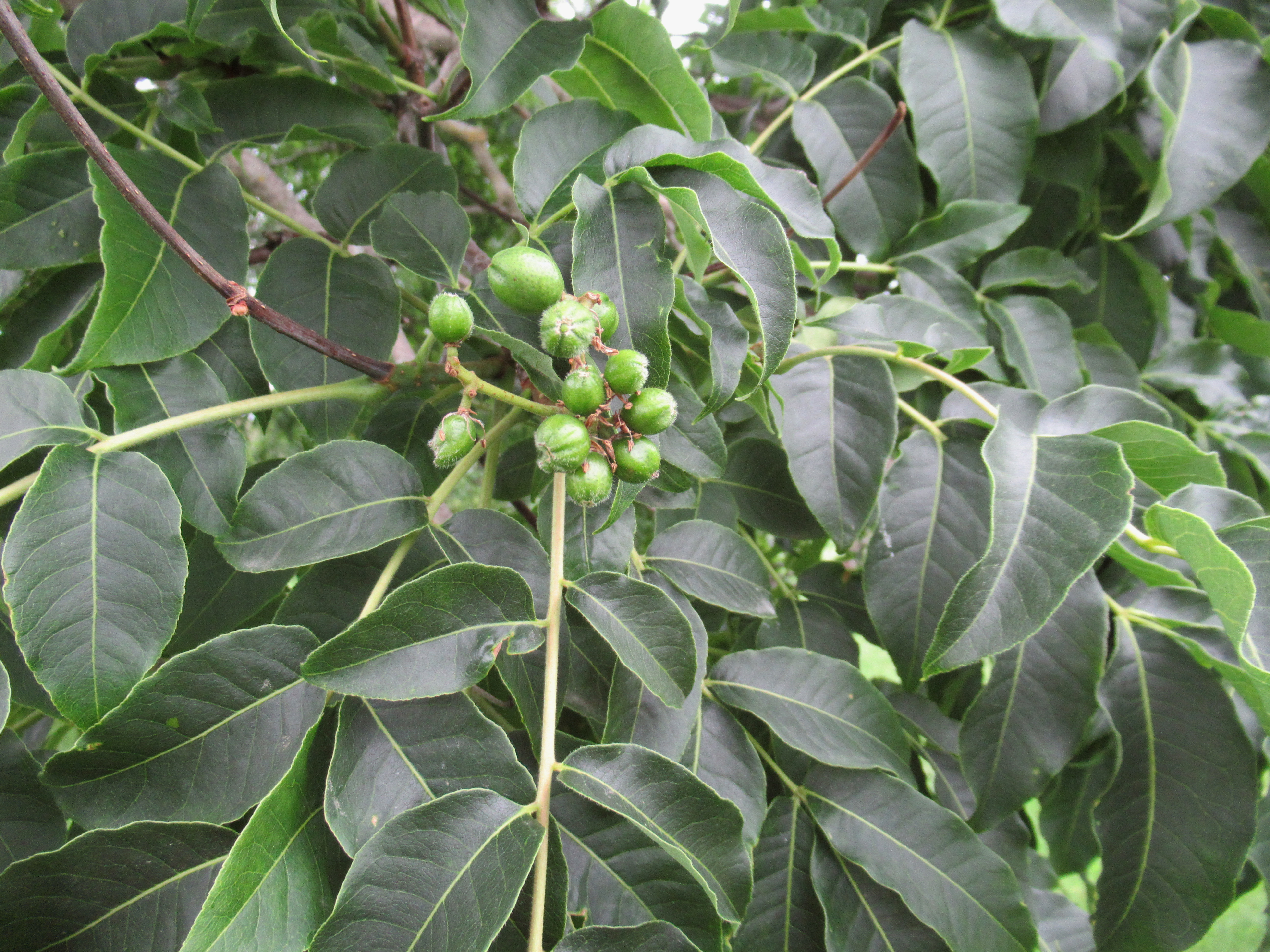 I looked in several tree identification sources. I wondered if it was some kind of nut tree judging by its fruit. One slight obstacle in identification is that trees in arboretums aren't necessarily from this country so I may have to go back and see if it's labelled, however I'm leaning towards it being some type of hickory.