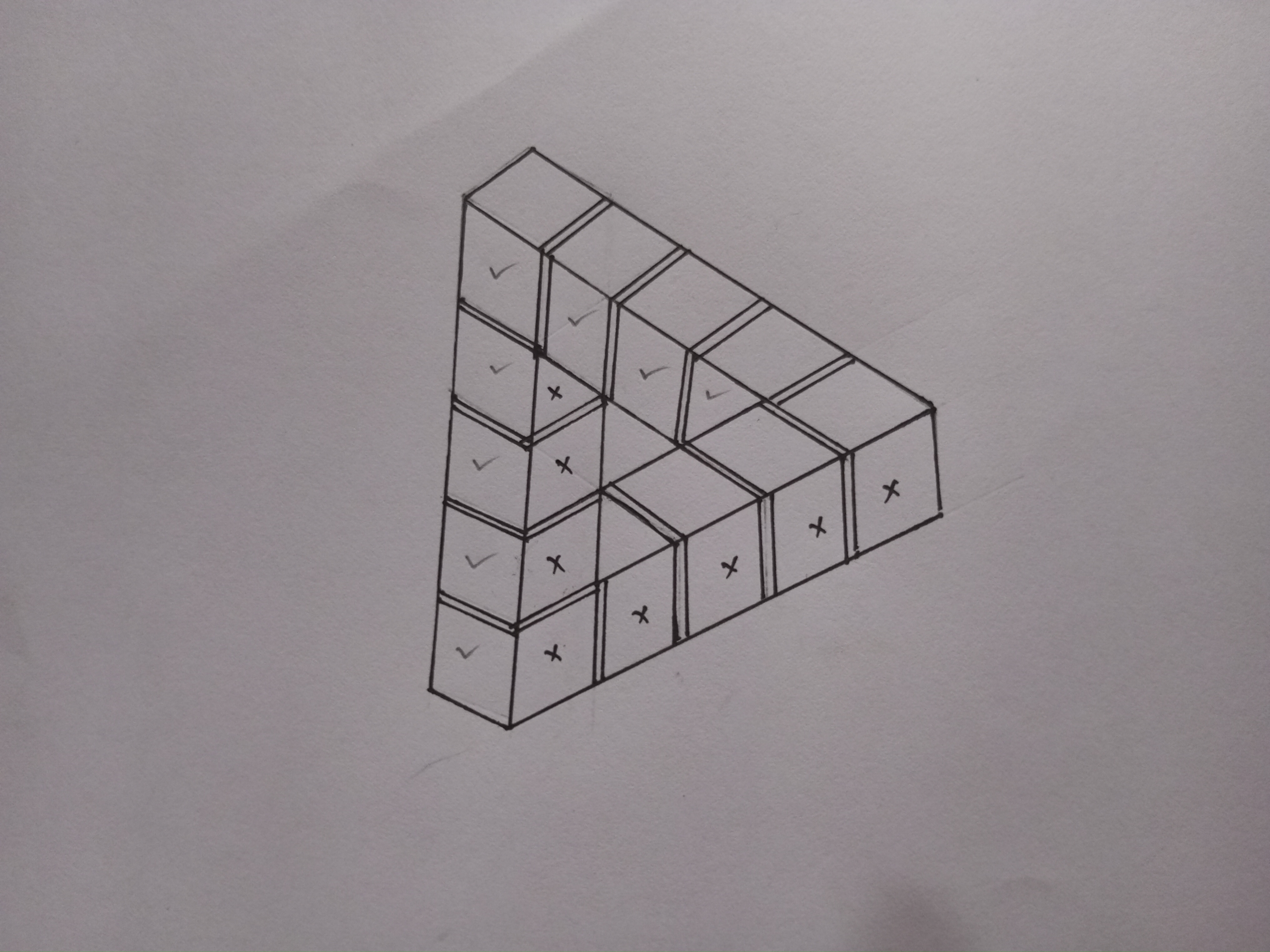 এরপর মার্কার দিয়ে যে সকল ঘরগুলো ভরাট করবো সেখানে ক্রস চিহ্ন দিয়েছি। আর যে সকল ঘরগুলো পেন্সিল স্কেচ করব সেখানে টিক চিহ্ন দিয়েছি।