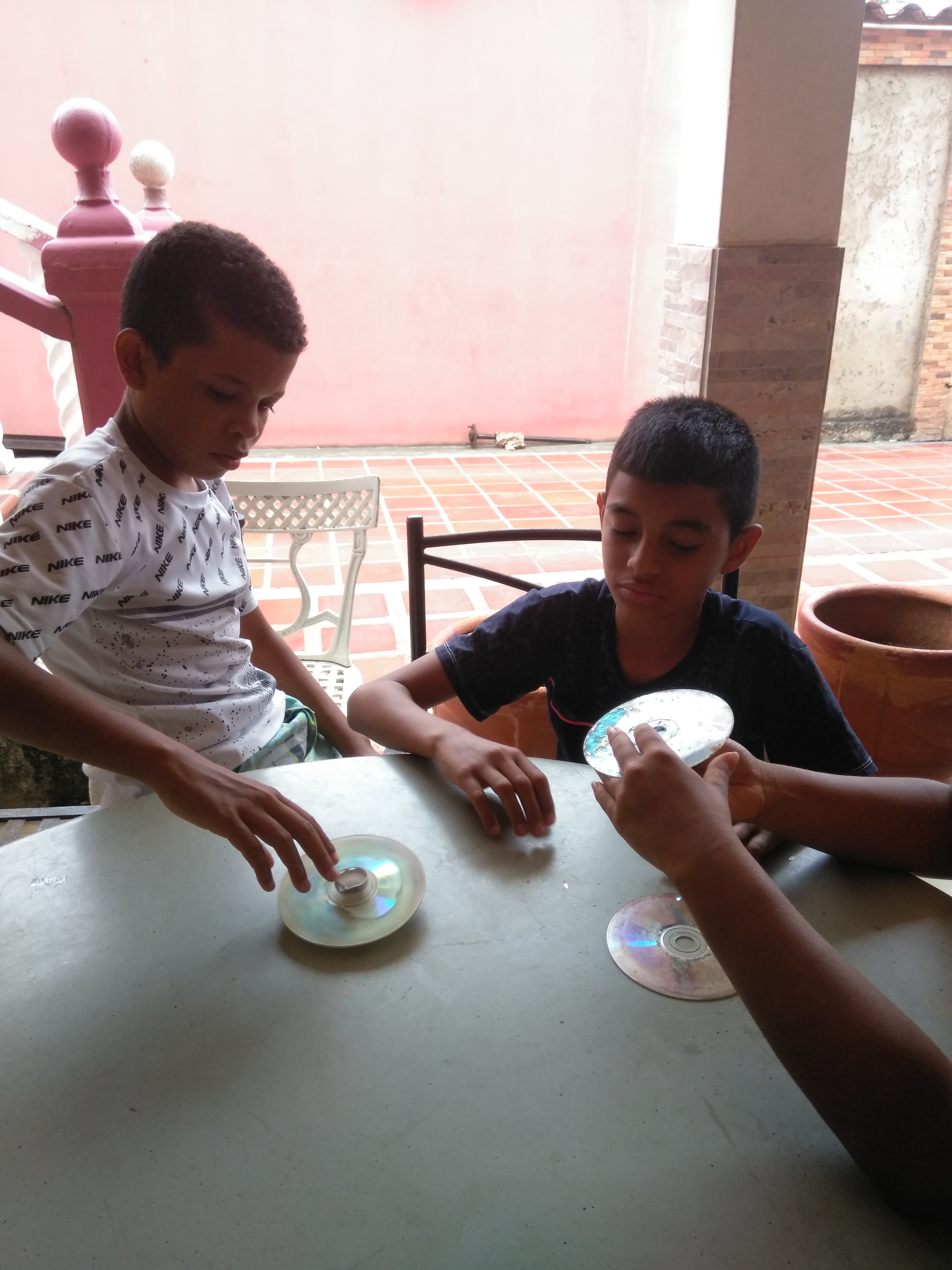 Con los CD y las puntas del tubo de crema dental, realizamos un trompo y con un hilo lo empezamos a lanzar.