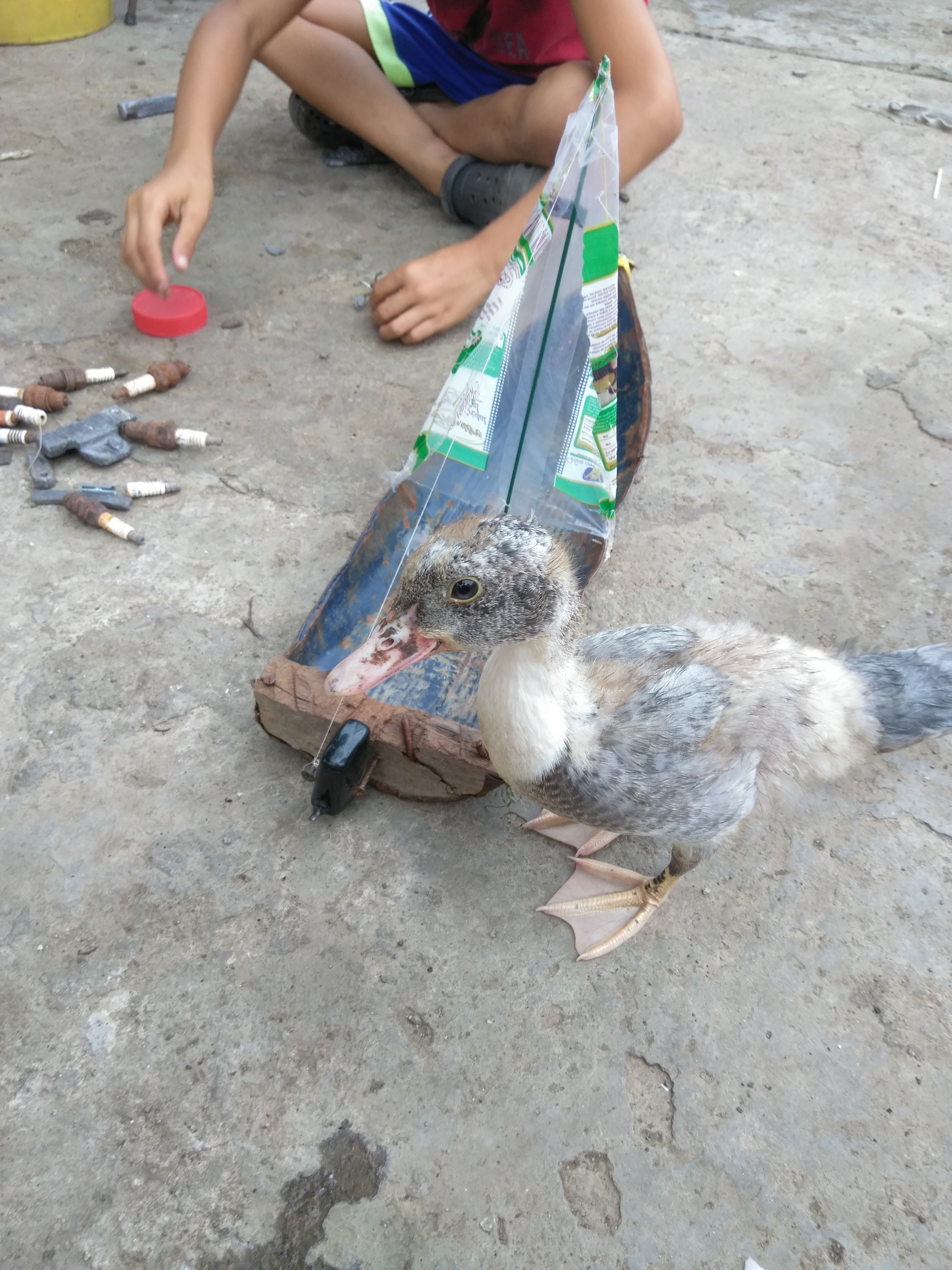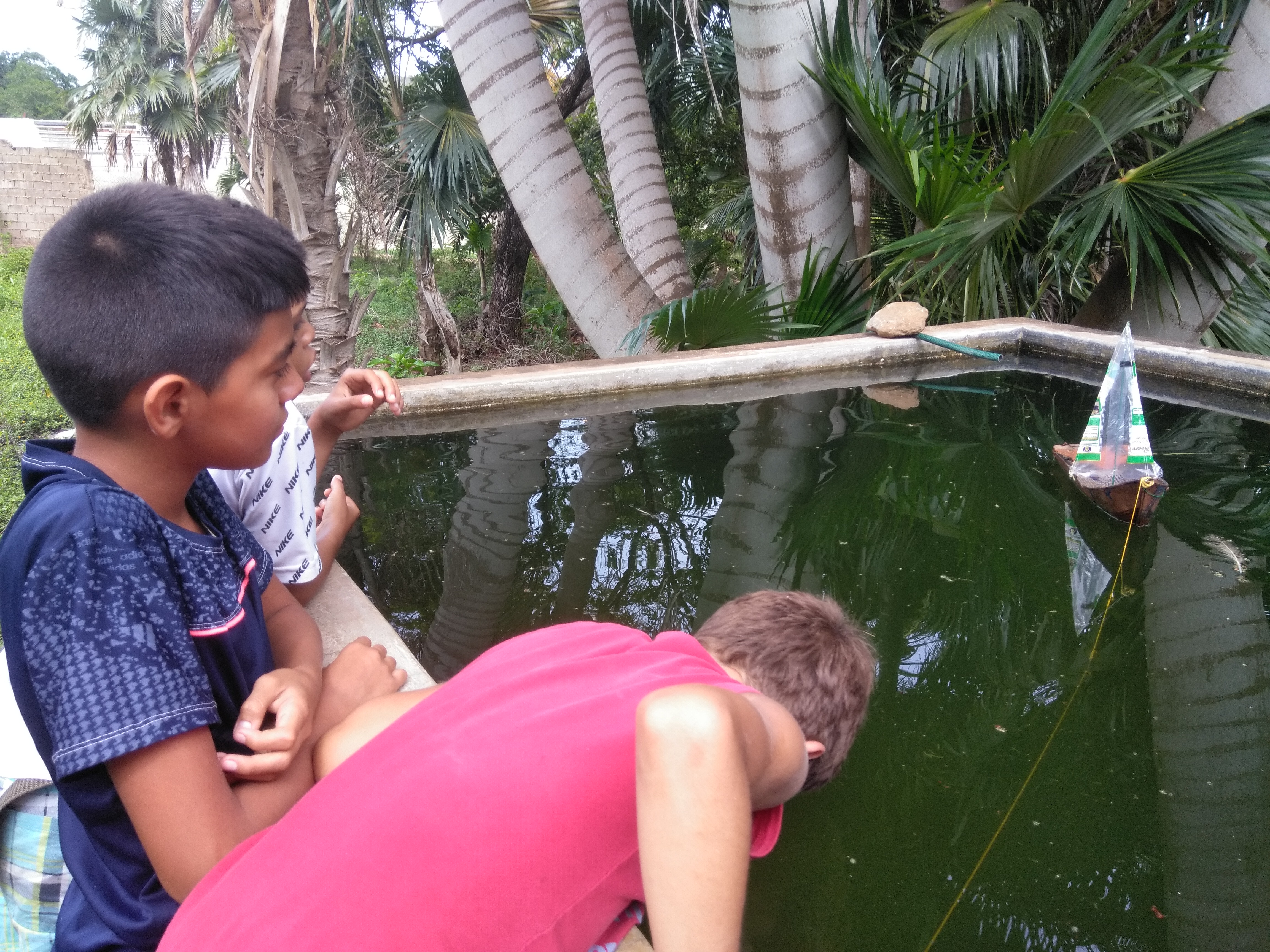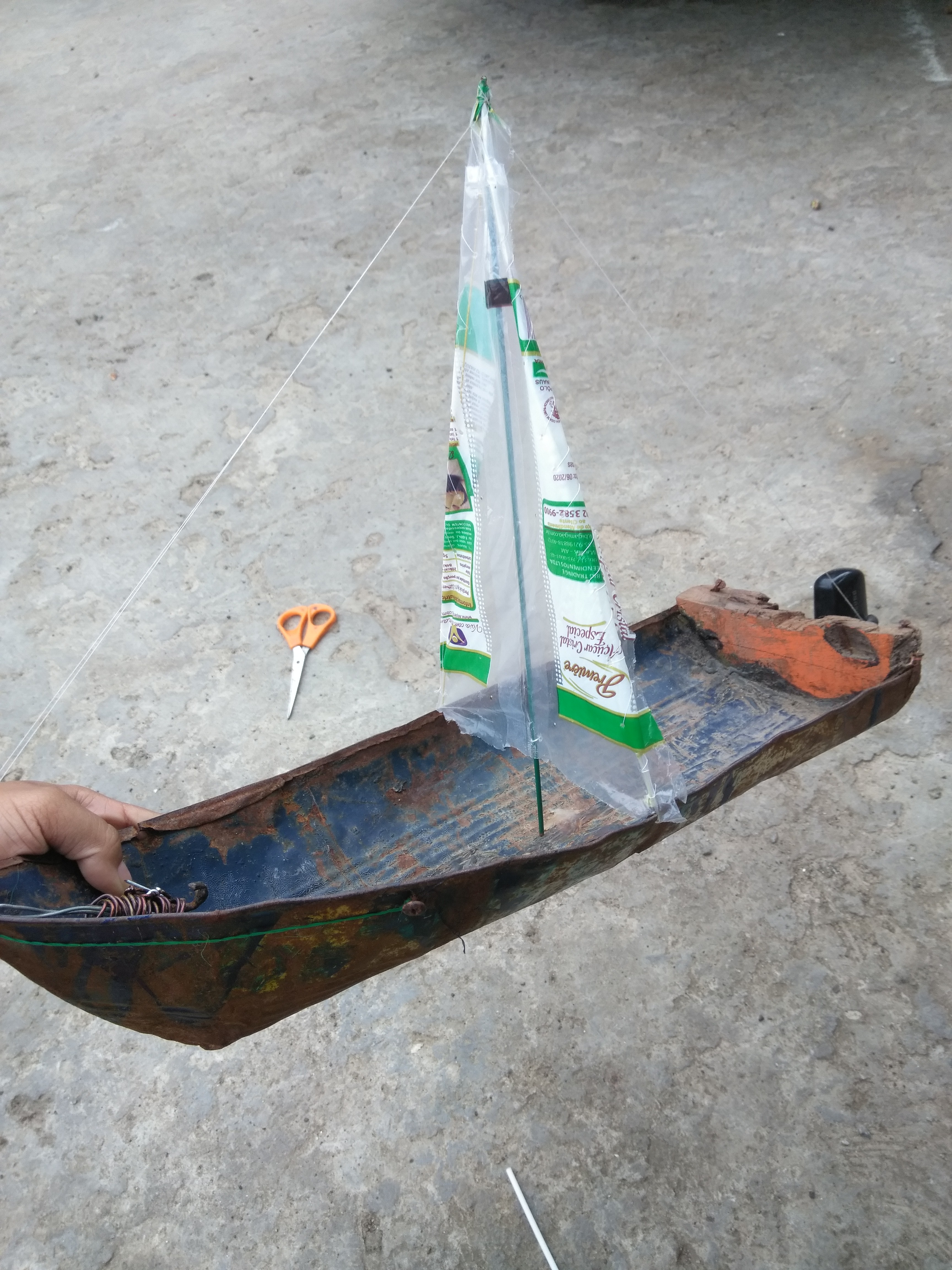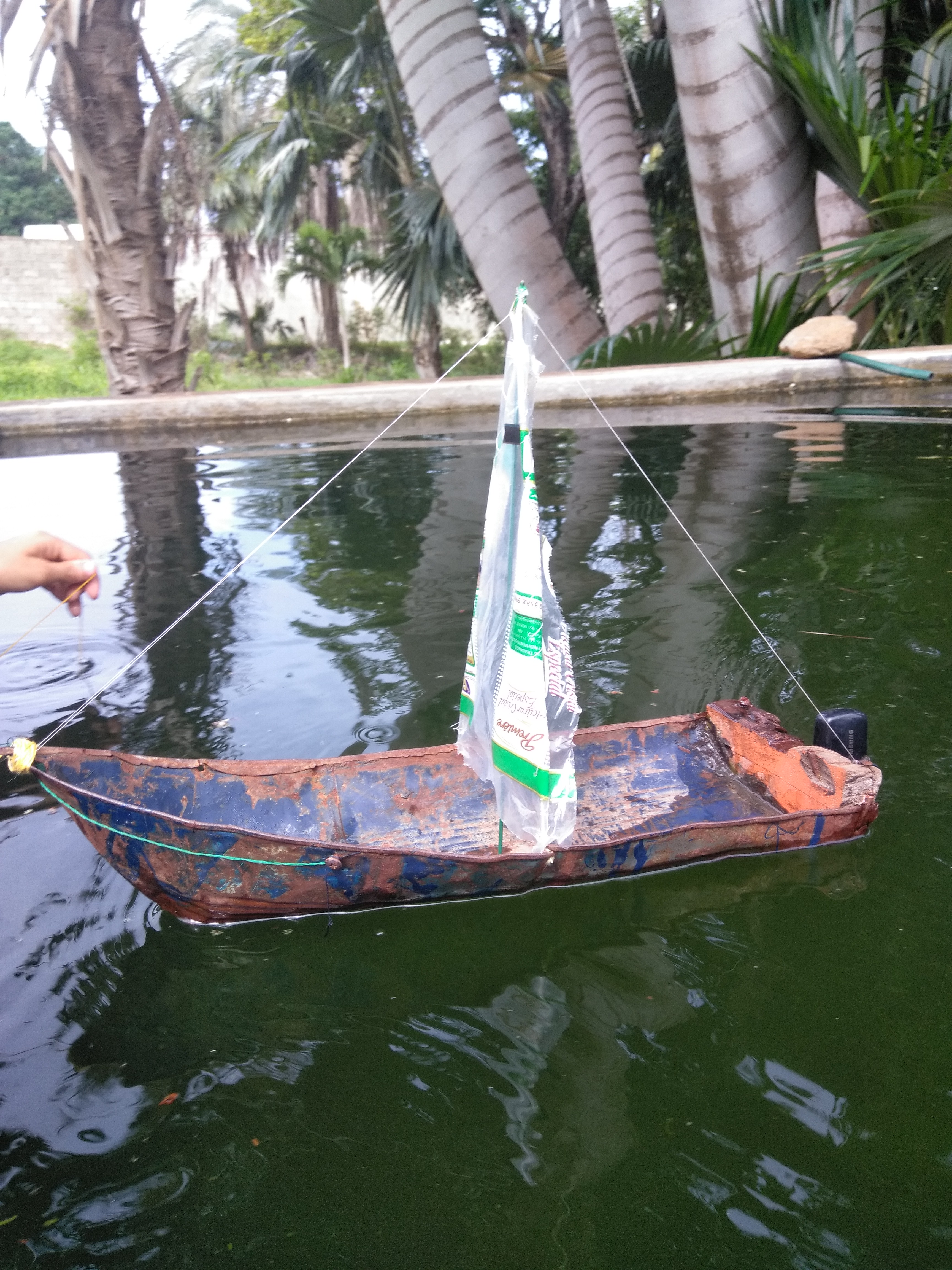 In the morning of today I found some friends who were playing and they told me how they built a boat with an iron milk can, a toothpick, a plastic bag, with other materials he made a motor, an anchor and then he started it in a water tank that you have to irrigate a plantation.