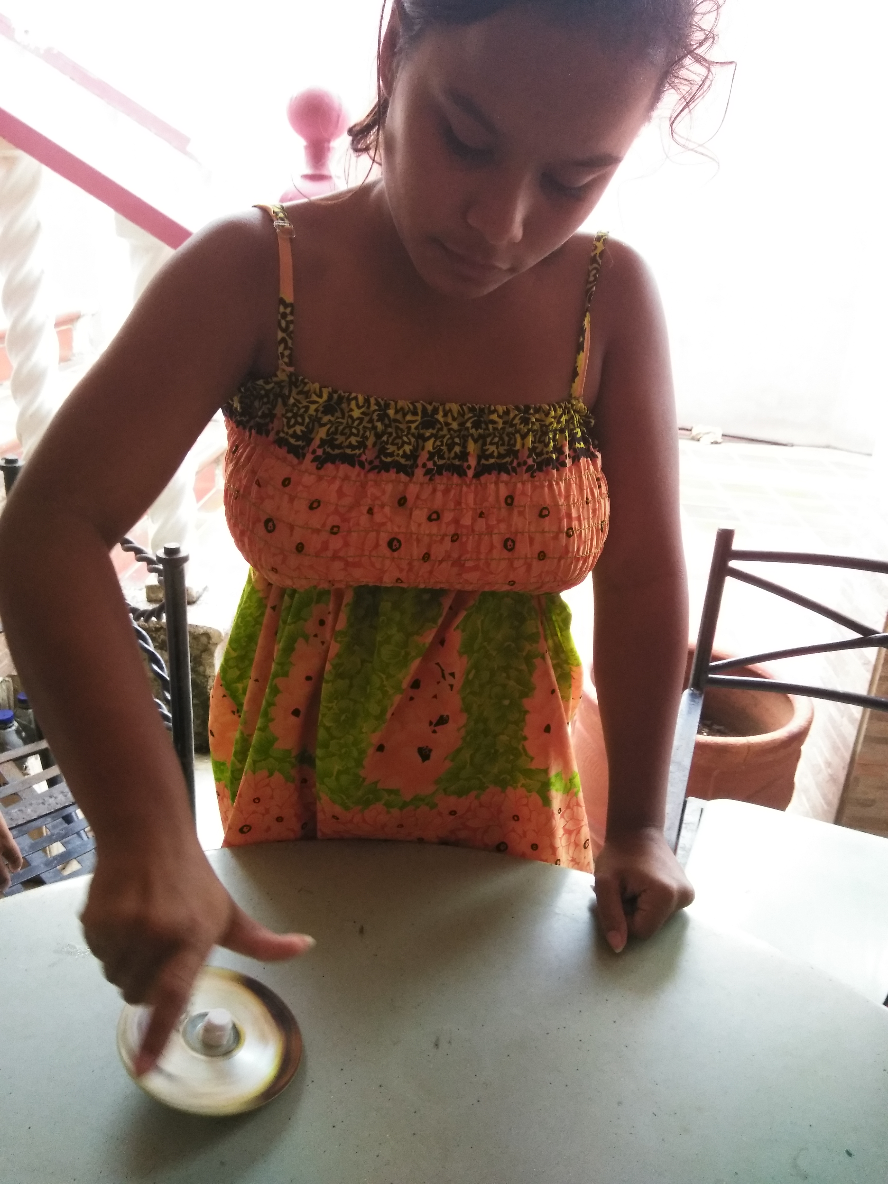 With the CDs and the tips of the toothpaste tube, we make a spinning top and with a thread we start throwing it.