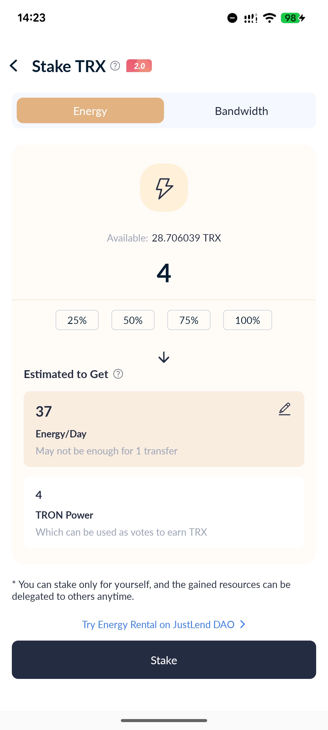 Here, I'm confirming my transaction to stake 4 TRX for personal use.