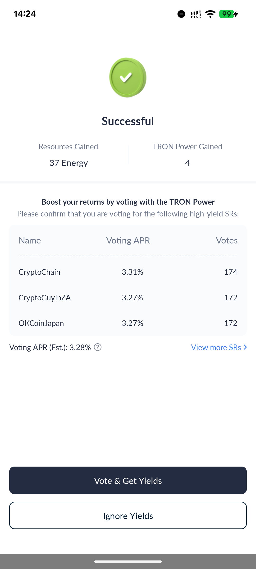 In this step, I've successfully staked 4 TRX. Now, I'll be voting to SRs.