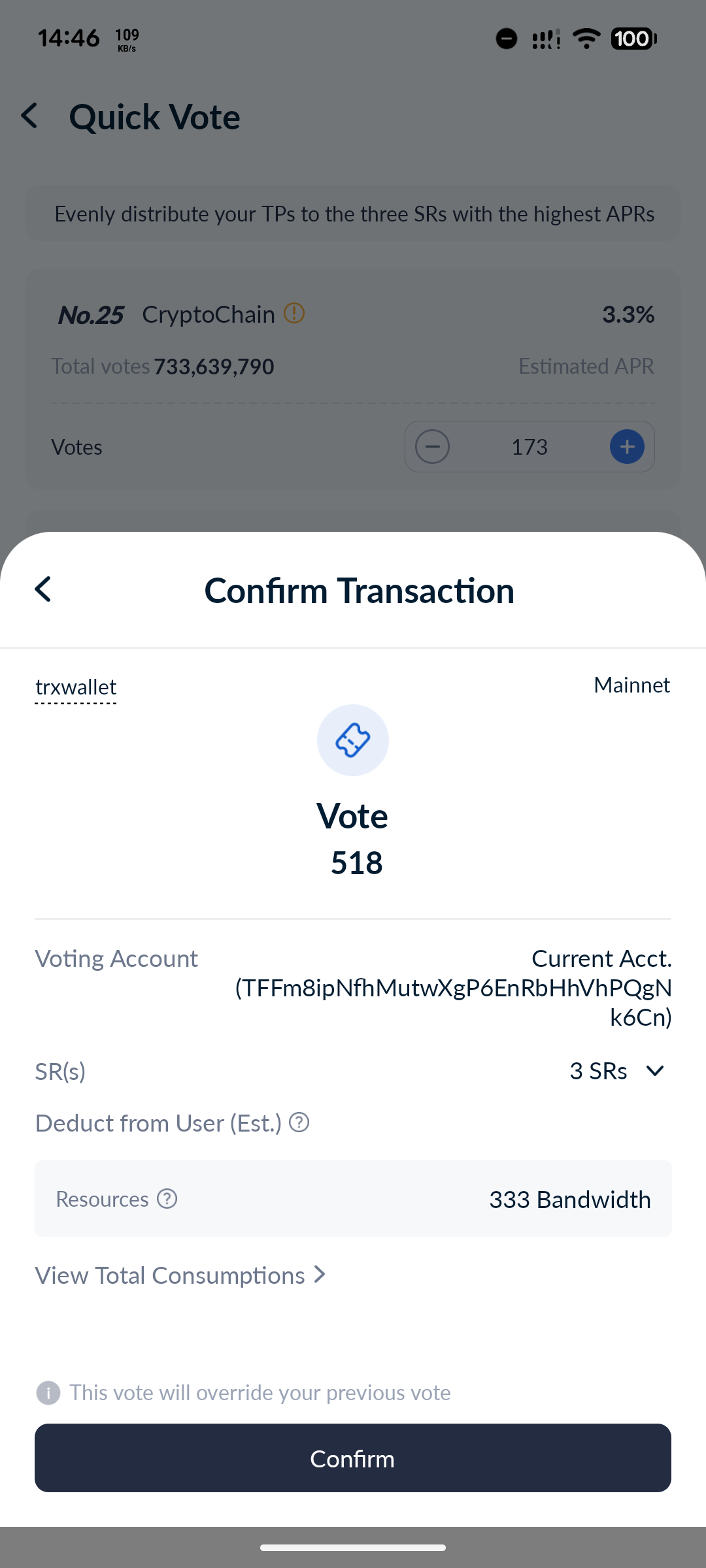 Now, I'm confirming my transaction to vote 3 SRs with total of 4 TRX.