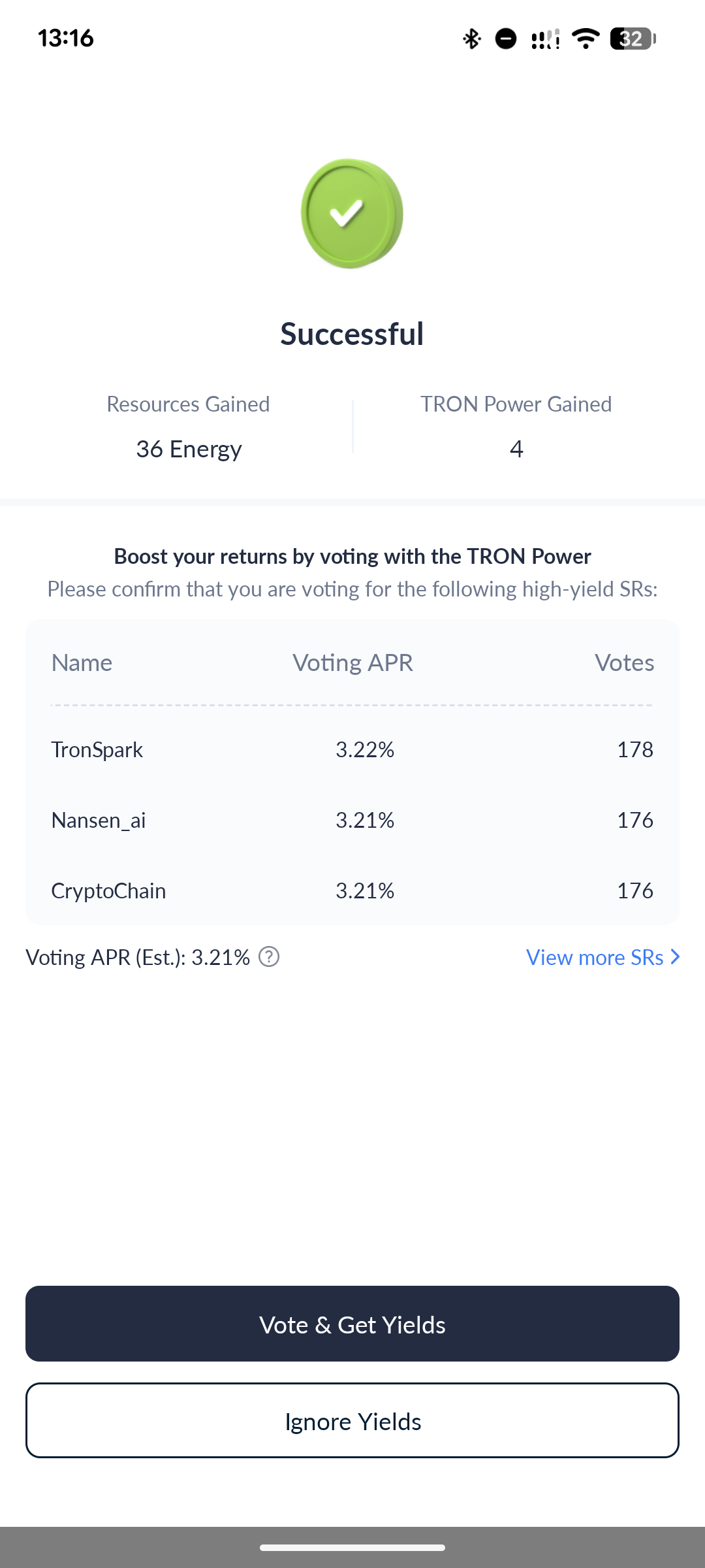 In this step, I've successfully staked 4 TRX. Now, I'll be voting to SRs.