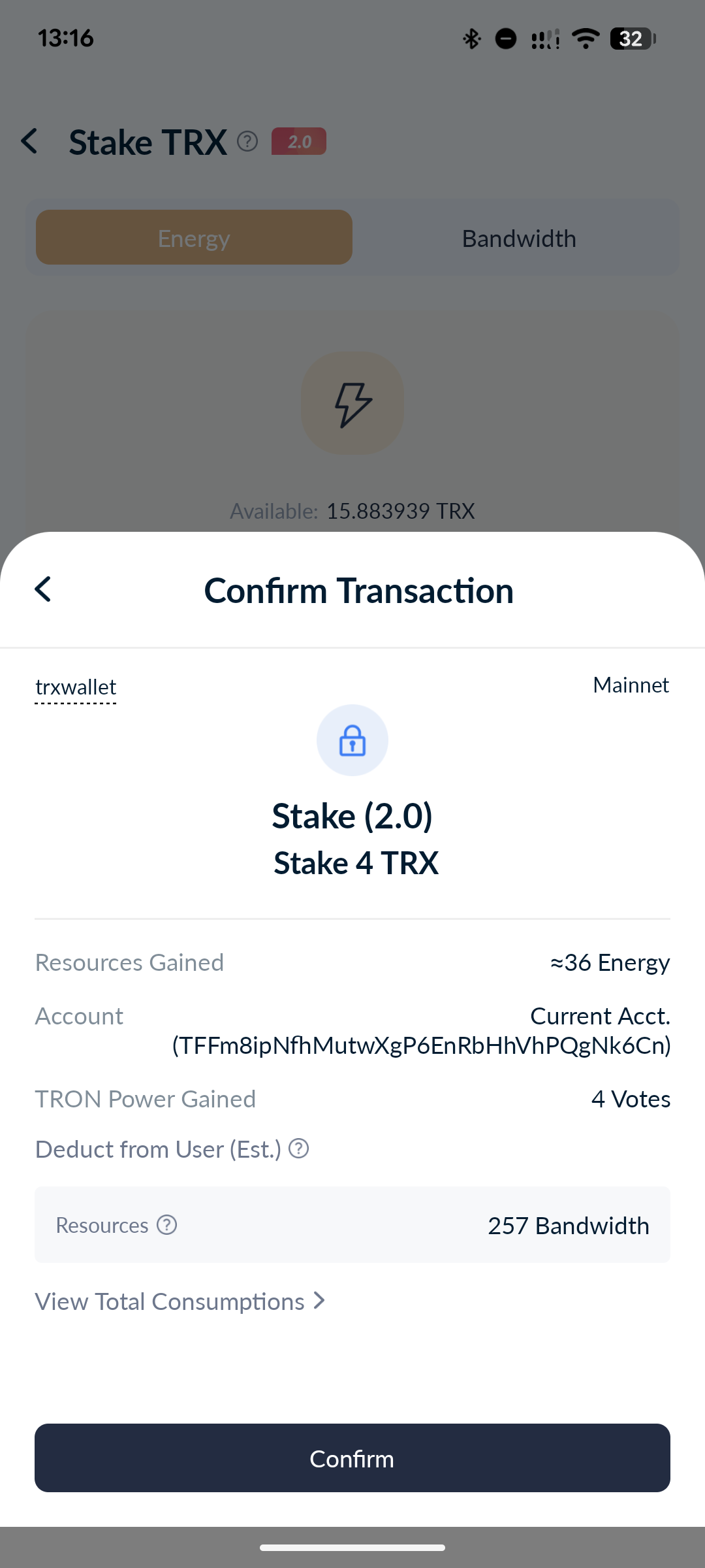 Here, I'm confirming my transaction to stake 4 TRX for personal use.