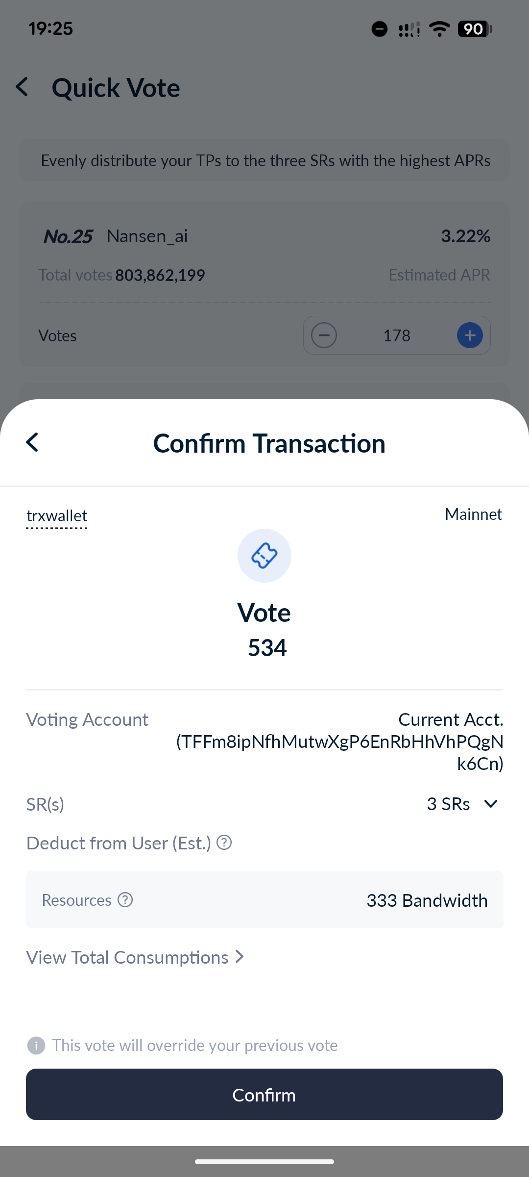 Now, I'm confirming my transaction to vote 3 SRs with total of 4 TRX.