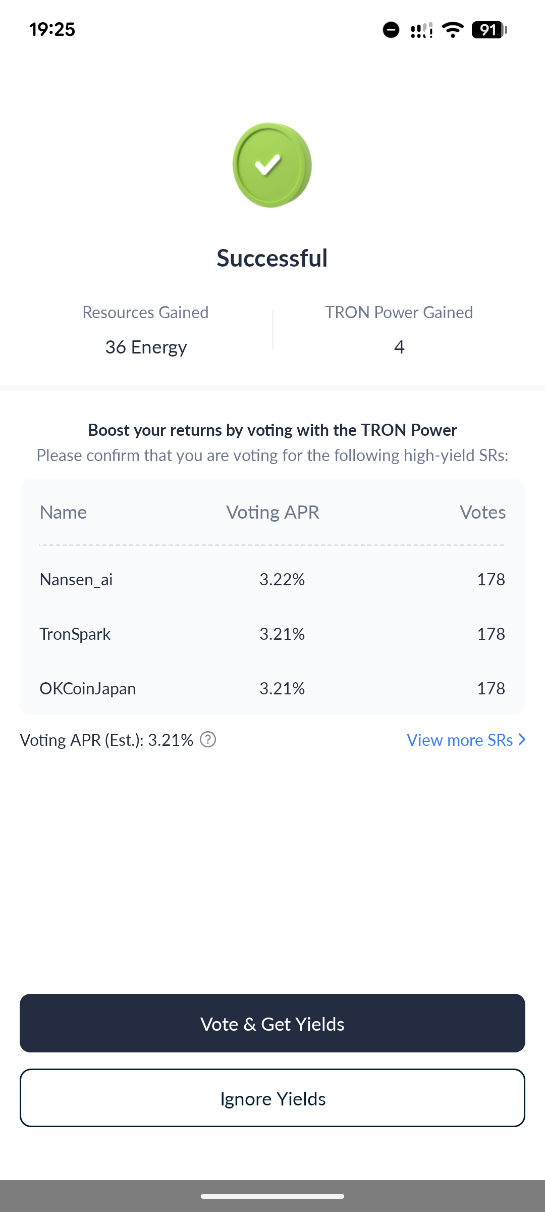 In this step, I've successfully staked 4 TRX. Now, I'll be voting to SRs.