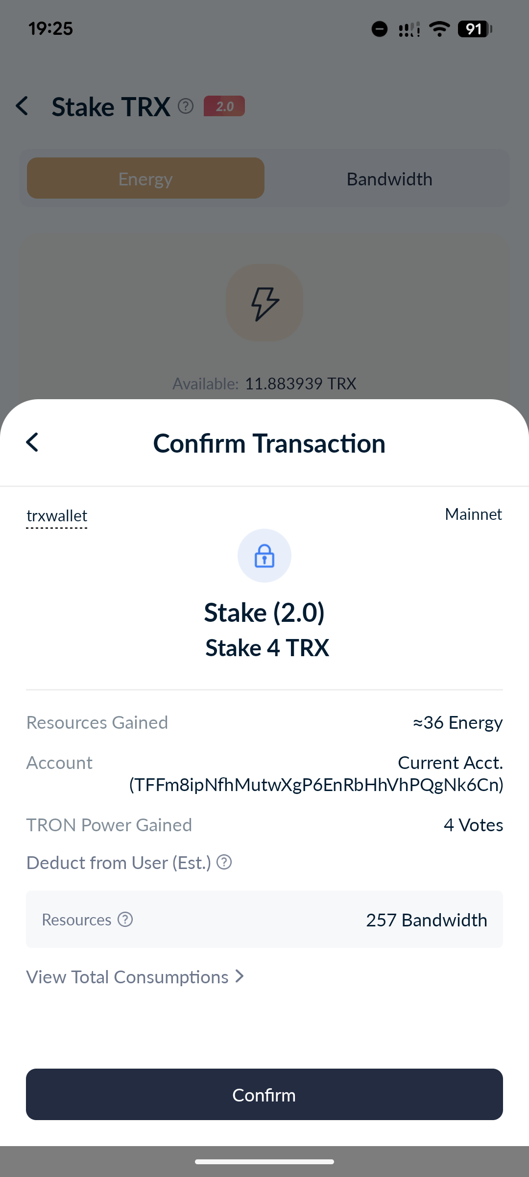 Here, I'm confirming my transaction to stake 4 TRX for personal use.