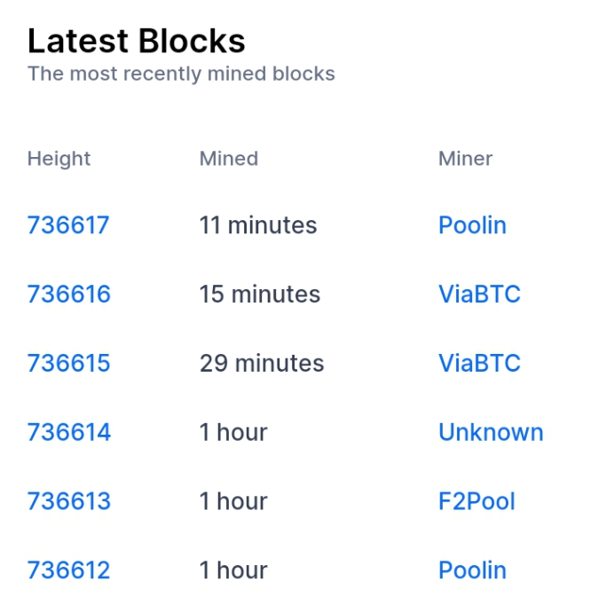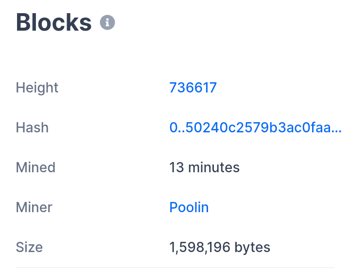 From the screenshot above, we see that the total mined Bitcoin block is 736617 and it was mined by poolin.