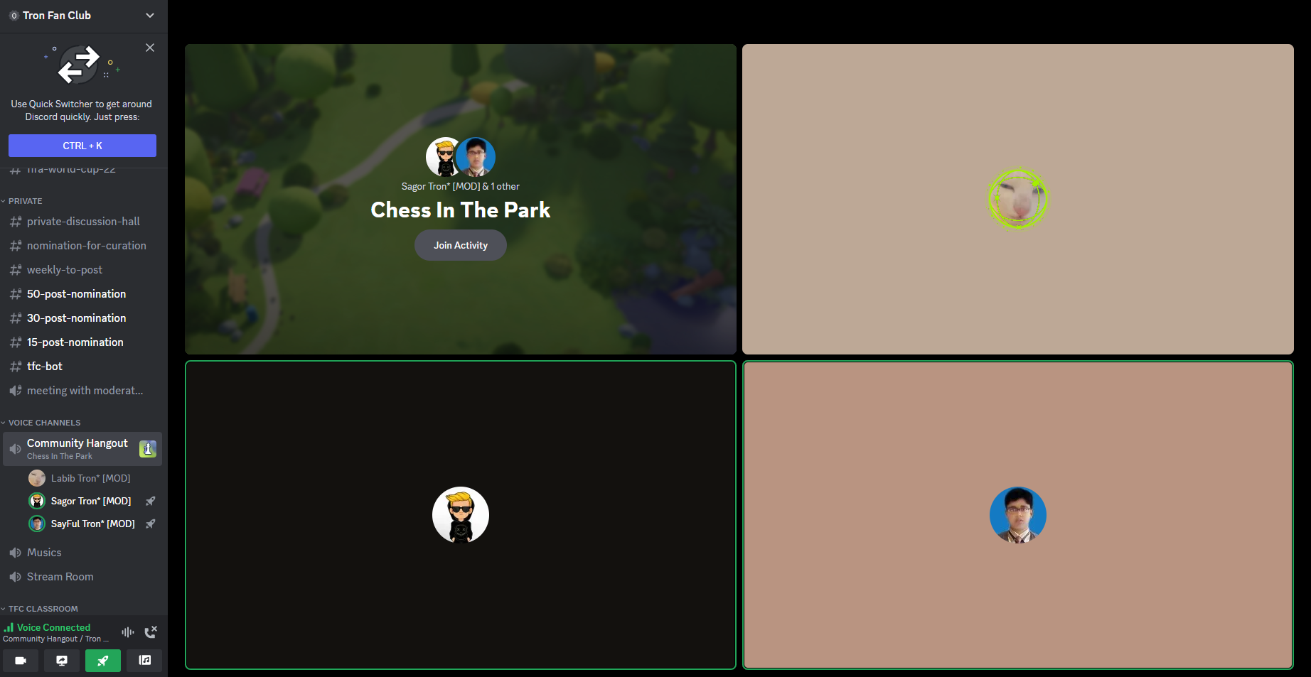 First you have to join the voice channel where the match will be hosted. Then click on the join activity option written below Chess in the Park Now you will have to click on create game or join game option. Who gets to host will be decided via toss. The winner of the toss will have to create the game and will get the chance to choose between white and black pieces. Just simply click on create game option after choosing the color. The other player will just have to simply join the created game. I hope that clears out any confusions regarding joining the game. Also try to have a good internet connection while playing the game/joining the game. Logging in for the first time takes a bit more time. So, try to join the game 5 to 10 minutes earlier in your first game. That's all. Hopefully nobody has any more questions or confusions regarding the tournament. Feel free to get in touch with us by creating a support ticket in the discord server of Tron Fan Club if you have any questions. We shall be more than happy to help. The matchmaking schedule will be provided in the discord server of Tron Fan Club. So always keep an eye on the discord server. See you in the arena.