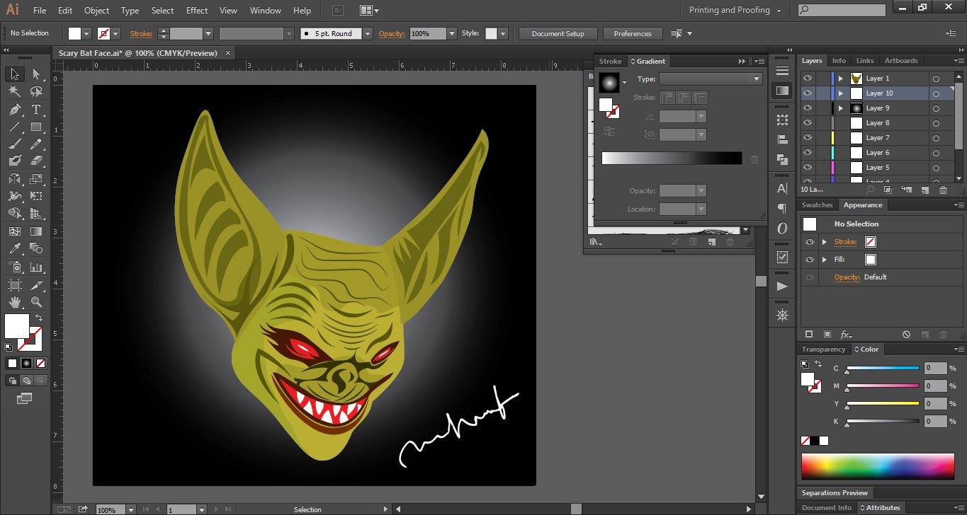 In step 10 I made the scary bat's eyes red and the background with a variant it color and then added my signature.