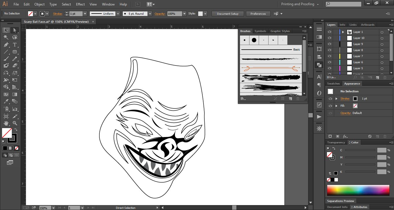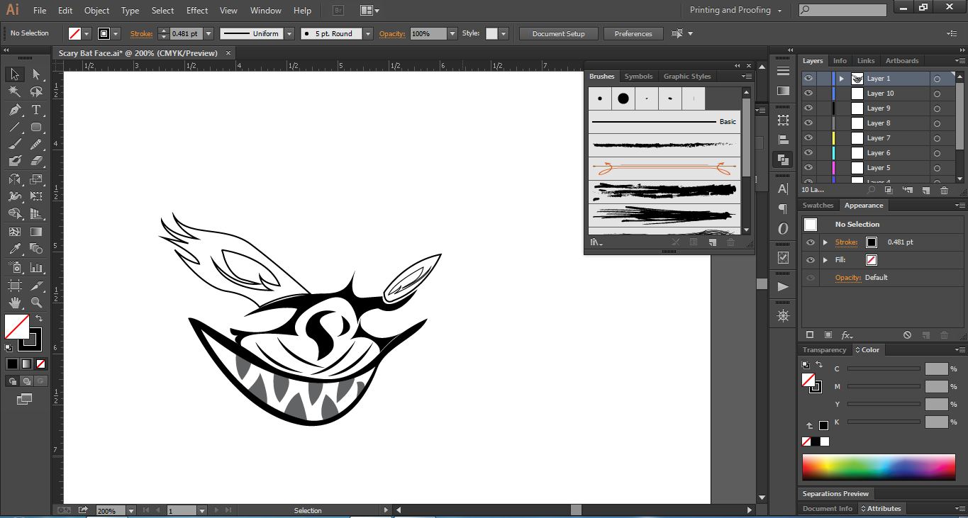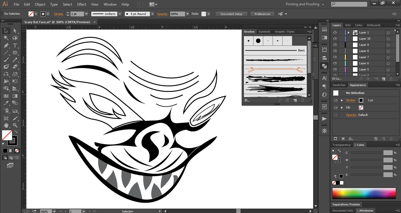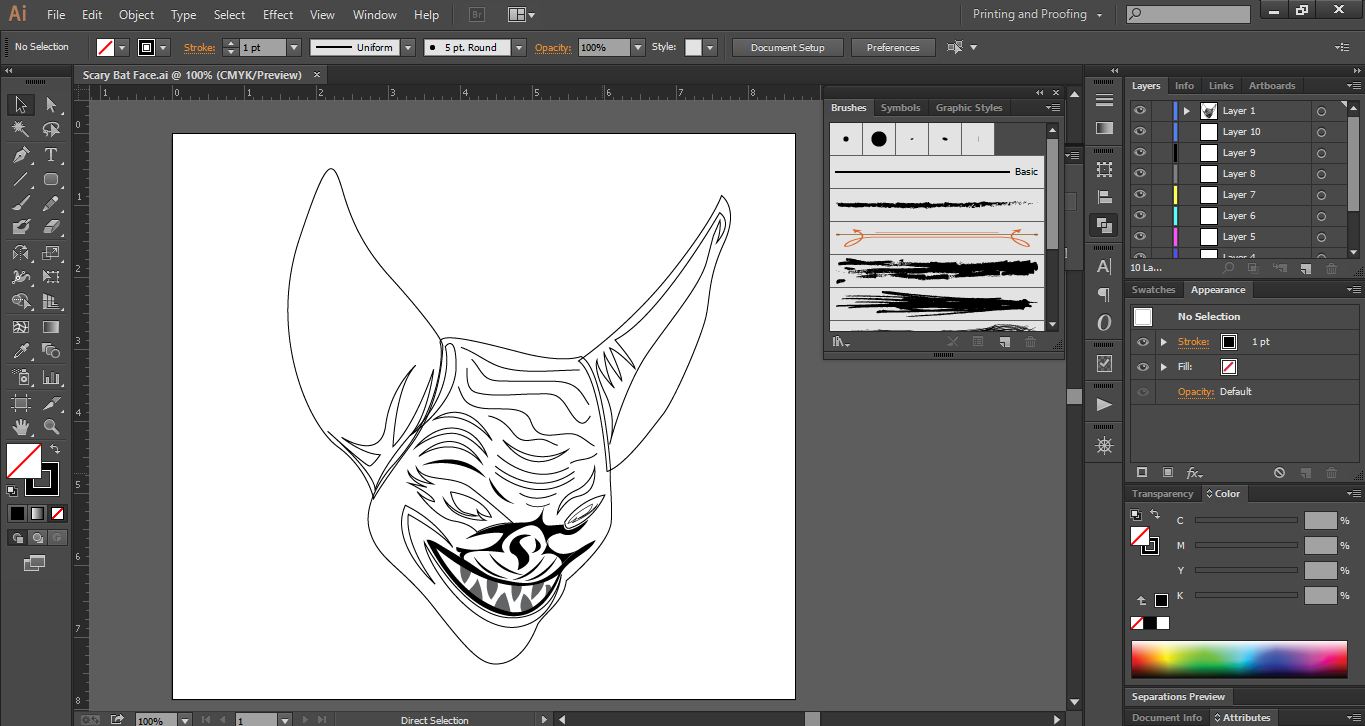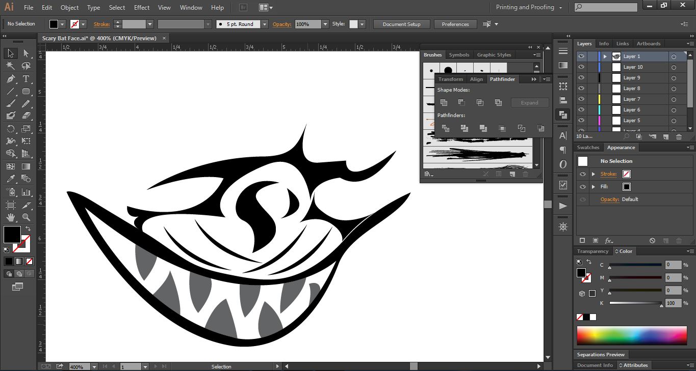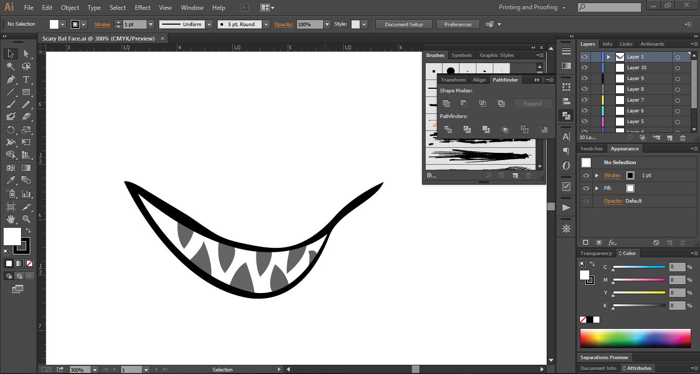 Launch Adobe Illustrator software, and open a new page. First I drew some teeth inside the scary bat's mouth and two lips on the top and bottom.