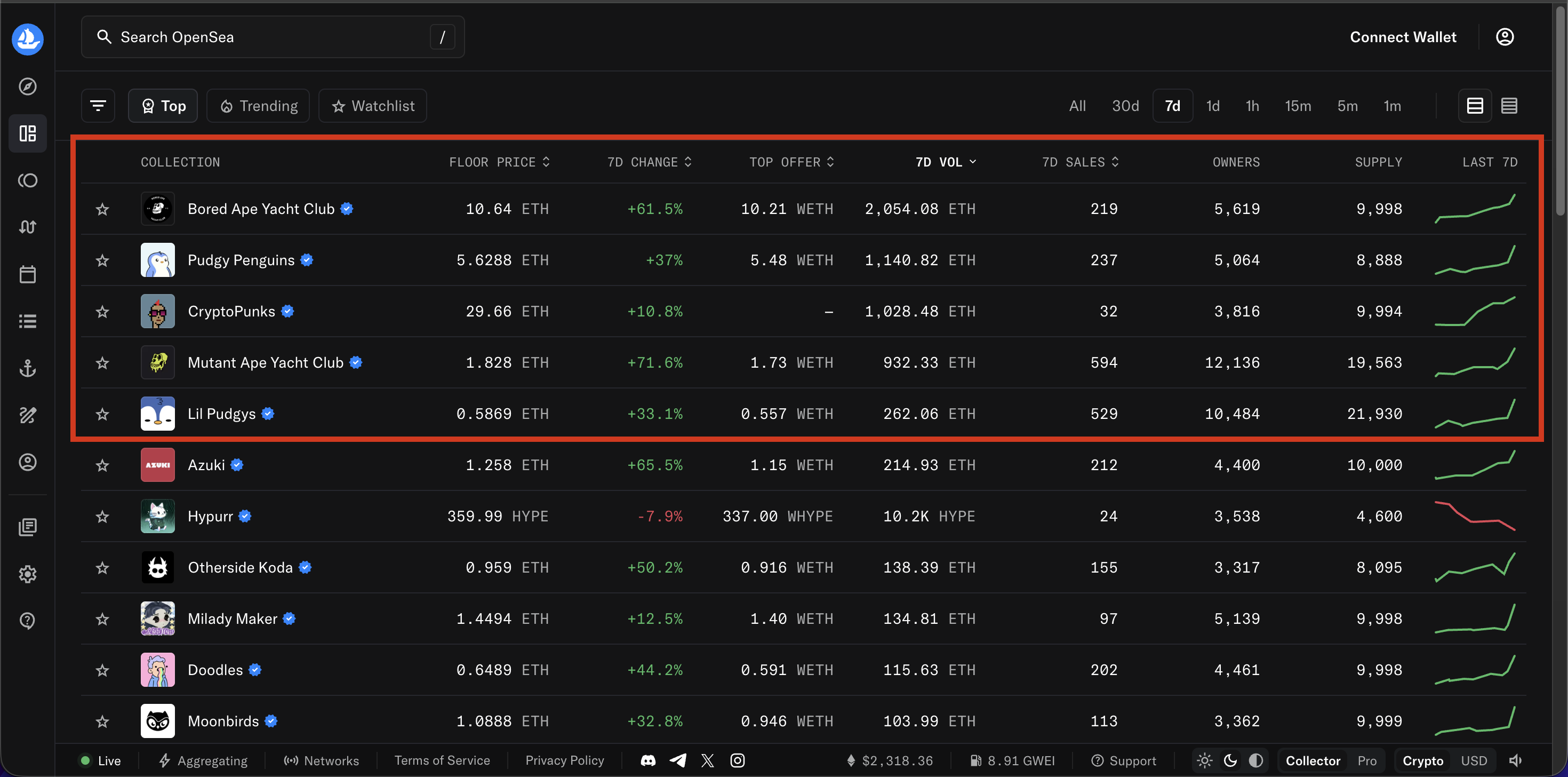 Lil Pudgys is in the 5th position of the ranking. The creator of this collection is TheIglooCompany. This collection has a total of 21,930 items. The weekly floor price of this collection is 0.5869 ETH. It means starting from the bottom. Last week, around 263.24 ETH was deposited in this collection. The weekly rate of change is +33.5%. A total of 531 items were sold this week.