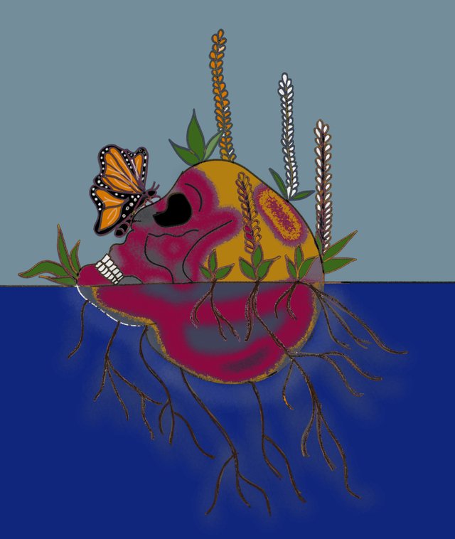Short Description:- This art is done by @fasoniya. The skull looks quite unique. It is lying in the water. And I can see algae in it. Again a butterfly has fallen in it. This scene is very nice to see. |
