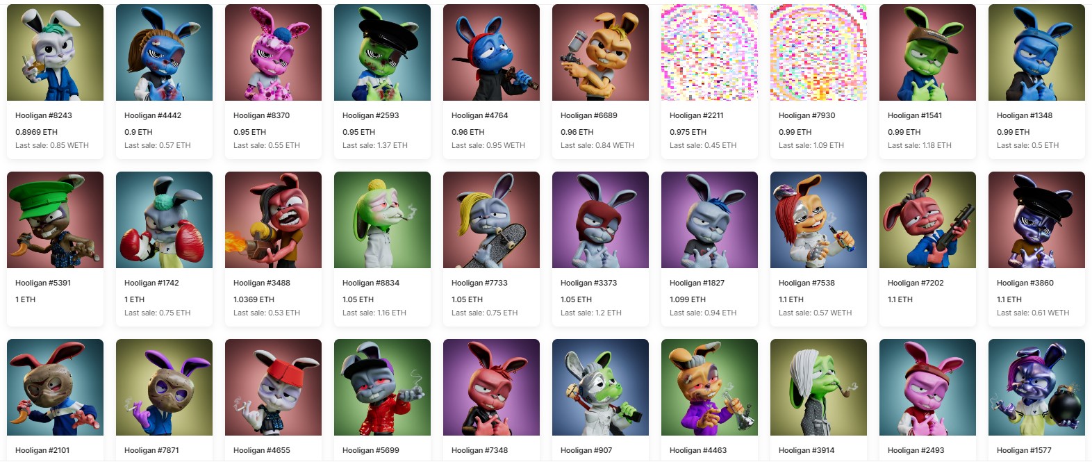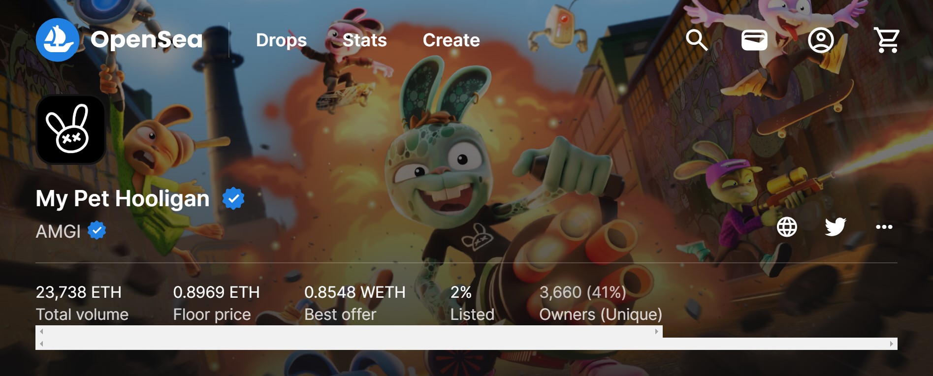 My Pet Hooligan This NFT collection has a volume of about 119 ETH in the last 7 days. It has increased by +278%. 100 items sold in last 7 days and It has increased by +203%. Again, last 7 days Floor price 0.8969 ETH.