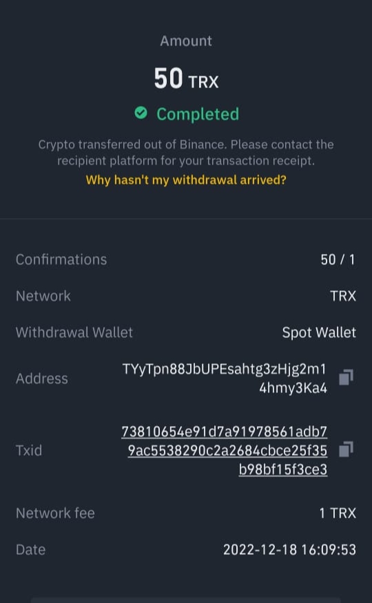 বাইনান্স এক্সচেঞ্জ সাইট থেকে আমার পার্সোনাল ট্রন ওয়ালেটে ট্রন পাঠানোর স্ক্রীনশট।