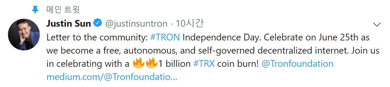 저스틴 선은 10억 트론의 소각을 전격 발표합니다.