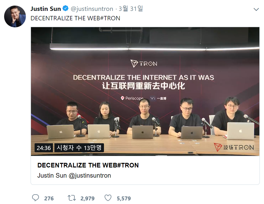 먼저 약 3개월 전, 트론 창립자 저스틴 선(Justin Sun)은 생방송으로 테스트넷에 대한 발표를 진행하였습니다. 트론 팀, 테스트 넷에 대한 소개는 물론, 메인넷의 기본적인 설계에 대해서도 전달을 하였는데요.