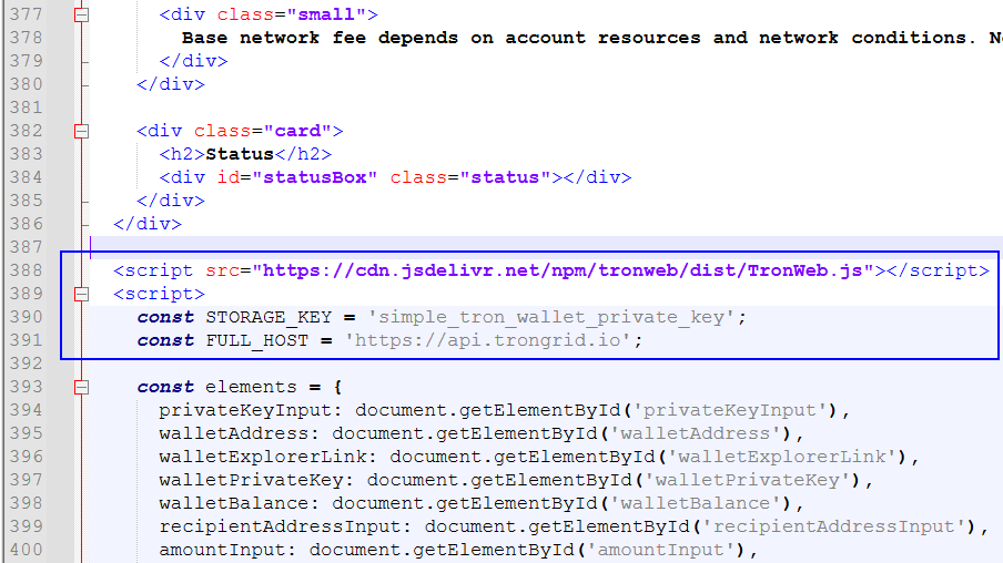 <script src="https://cdn.jsdelivr.net/npm/tronweb/dist/TronWeb.js"></script> — connection to the external JavaScript library TronWeb. For your own safety you can download the TronWeb.js file and connect it to the wallet locally. But that is optional.