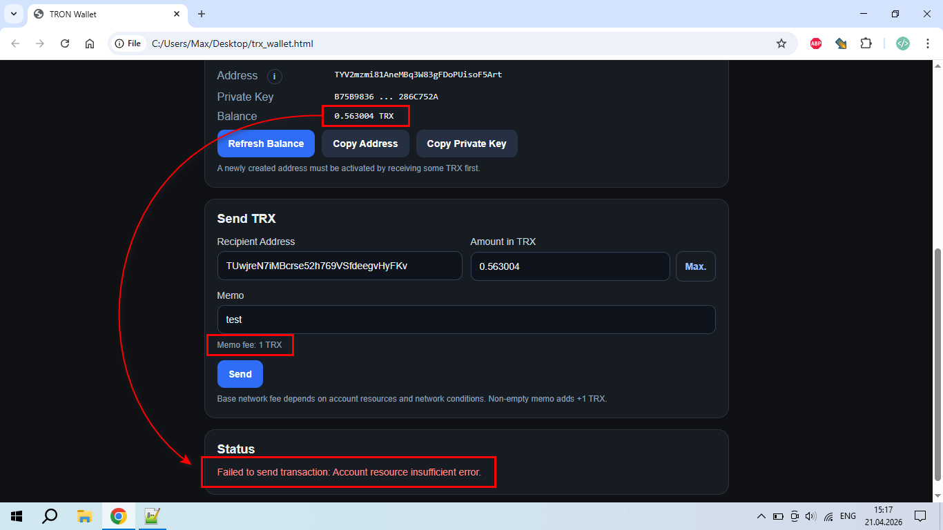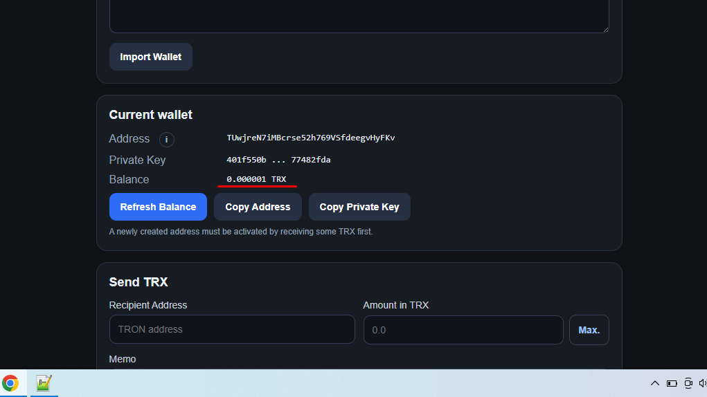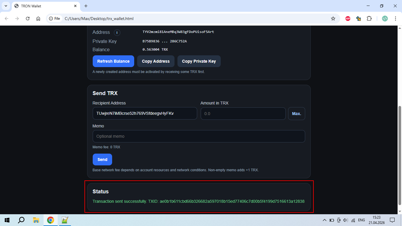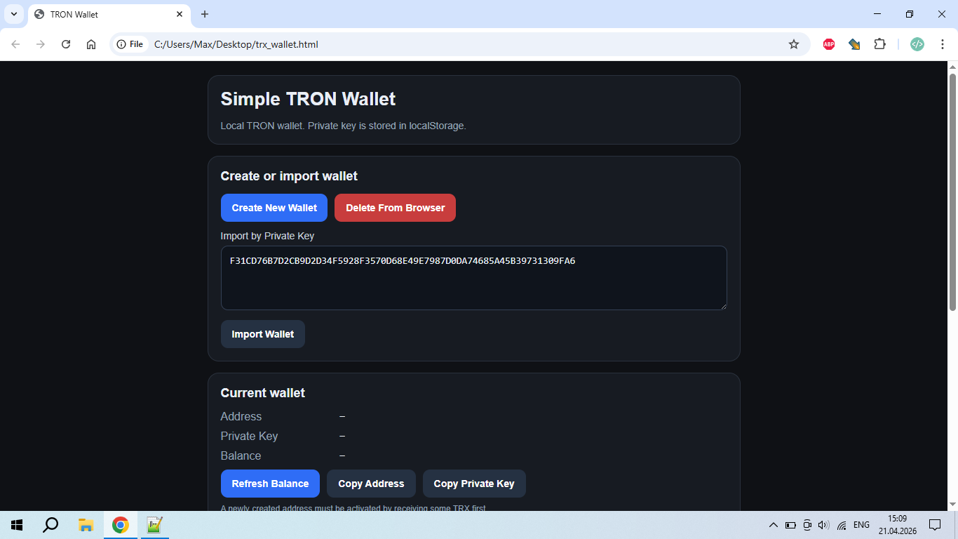 I want to present a local web-wallet for Tron that works directly in the browser. I feel like I’ve "reinvented the wheel", but I really liked how this idea turned out. So, what can it do? It can create a new Tron wallet, restore an existing one from a private key, save the private key in the browser’s localStorage, display the wallet address and balance, automatically update the balance, send TRX, add a memo to a transfer, and withdraw all funds using the "Max" button so the remaining balance is zero.