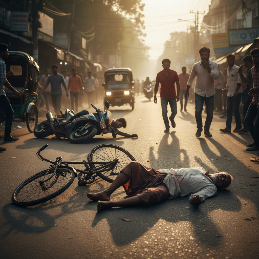 মোটরসাইকেল চালকটি তখন রাস্তার এক পাশে দাঁড়িয়ে। বয়স খুব বেশি না হয়তো বিশ-পঁচিশ বছরের যুবক। মুখটা ফ্যাকাশে হয়ে গেছে, চোখে আতঙ্ক। সে বারবার বলছিল,ভাই, আমার ভুল হয়ে গেছে… আমি বুঝতে পারিনি…কিন্তু চারপাশের মানুষের রাগ যেন তার কথা ঢেকে দিচ্ছিল। কেউ তাকে ধমক দিচ্ছে, কেউ বলছে,এত জোরে বাইক চালাও কেন?লাইসেন্স আছে তো? আমি ধীরে ধীরে এগিয়ে গেলাম। নিজের অজান্তেই মনে হচ্ছিল কিছু একটা করা দরকার। একজন মাঝবয়সী লোক বৃদ্ধের মাথার নিচে নিজের গামছা গুটিয়ে দিলেন, যেন মাথাটা একটু উঁচু থাকে। আরেকজন পানি এনে মুখে ছিটাতে চাইলেন, কিন্তু একজন বুদ্ধিমান মানুষ তাকে থামিয়ে দিলেন,