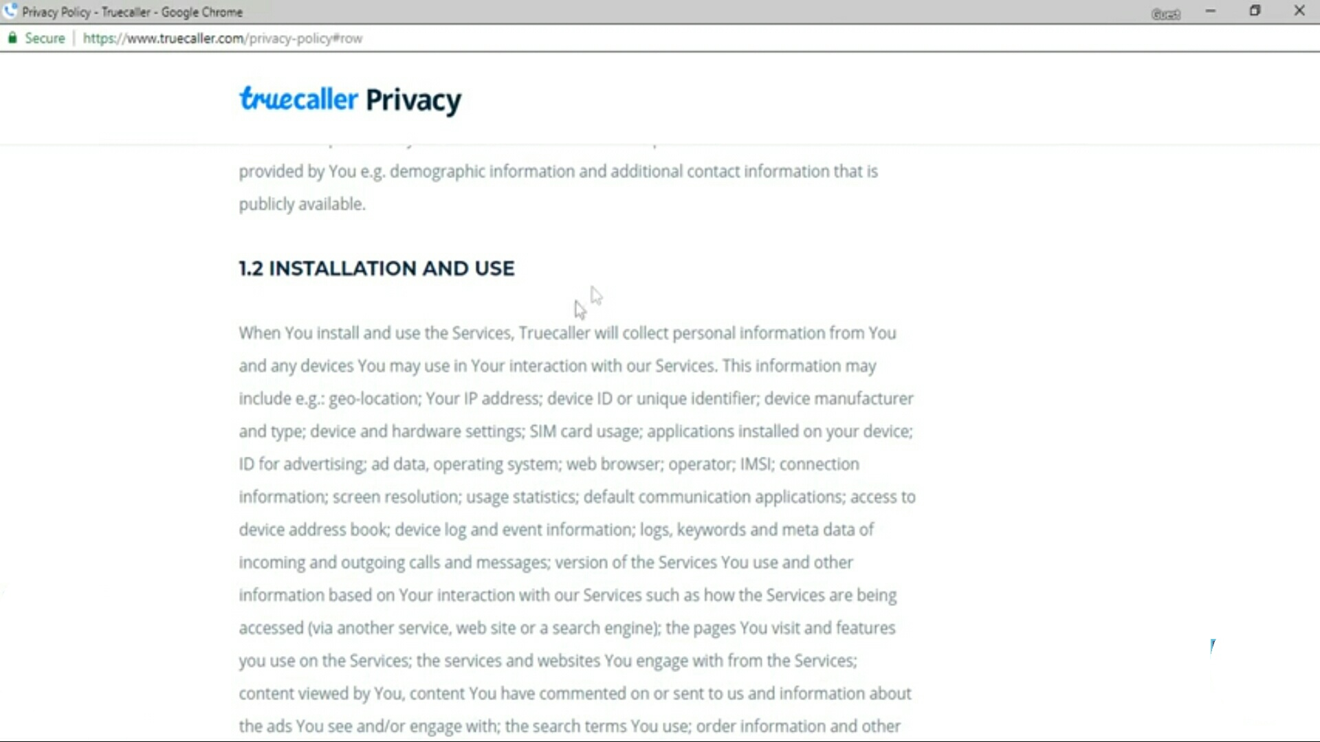 अब जब भी आपको कॉल आएगा तो ऑटोमेटिकली इसकी डेटाबेस में ढूंढेगा जो की पूरा इसने मैच करके रखा हुआ है और आपको वहां से नाम उठाकर दिखा देगा.इसका मतलब ऐ है कि हमारे डिटेल लेकर हम को दूसरों का डाटा दिखा रहा है.यह तो वही बात हो गई मैं आपके घर एक पेपर पर लेकर आऊं बोलो कि भाई आपके घर में कितने लोग हैं सबका नाम,नंबर लिख दो फिर कभी आपको किसी की information चाहिऐ तो मुझे बताना क्योंकि मैंने सबके घर से यही लेटर लिखवाया हुआ है.तो इससे हमारी प्राइवसी खराब होती है जैसे ही हम उसकी मोबाइल ऐप डालते हमारे फोन में.हमारा सारा डाटा उठाकर ले जाता है.आप इनकी वेबसाइट पर जाते हो और वहा इनकी प्राइवेसी प्रोटेक्शन पडते हो तो ऐ लोग बताएंगे कि आपका क्या क्या डाटा है यह लोग आपसे लेते है.आपका ज्योग्राफिकल लोकेशन,आपके आई पी एड्रेस,आपकी डिवाइस की ID,आपकी डिवाइस का मैन्यूफैक्चर कौन कौन है,सिम का कार्ड कौनसा यूज़ हो रहा है,उसके बाद आपने कौन-कौन सी एप्लीकेशन install कर रखी है,आपके फोन का एडवरटाइजिंग ID हो गया,ऑपरेटिंग सिस्टम हो गया,वेब ब्राउजर हो गया,आई ई एम आय नंबर हो गया,स्क्रीन का रिझॅलेशन क्या है,आपके फोन में क्या क्या यूज हो रहा है,डिफ़ॉल्ट कम्युनिकेशन एप्लीकेशन कौन-कौन सी डाल कर रखी है,आपके एड्रेस बुक क्या-क्या है,आपके डिवाइस का लॉक क्या है,इनकमिंग आउटगोइंग मैसेजेस इतना सारा डाटा ऐ आप ही के फोन से upload कर रहे है और यह आपको पता भी नही चल रहा.