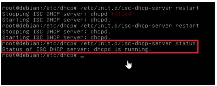Setelah selesai melakukan perubahan pada konfigurasi di bagian isc-dhcp-server maka kita dapat mengaktifkan setting ini dengan menjalankan perintah: root@debian:~#/etc/init.d/isc-dhcp-server restart. Hal ini bertujuan untuk memeriksa apakah settingan ini sudah benar.
