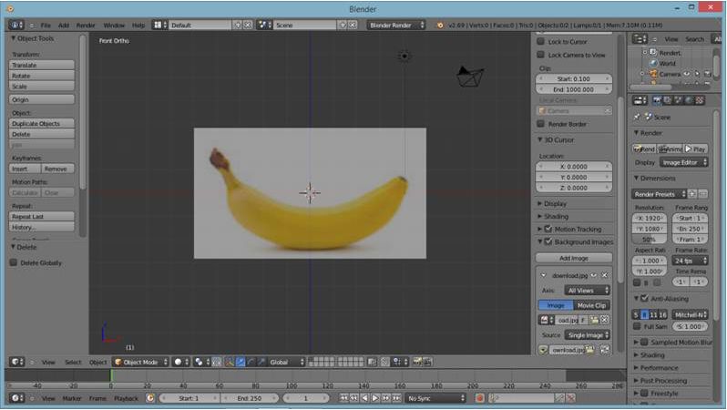 2.Kemudian masukkan objek pisang berformat .jpeg yang akan kita buat objek 3D nya dengan menggunakan shortcut N untuk memunculkan toolbar transform, lalu centang option Background Images >> Add Image >> pilih gambar pisang yang akan kita gunakan.