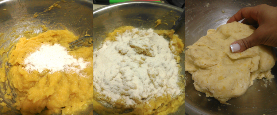 6.- Una vez que tengas una mezcla más ligera procede a agregarle harina de maíz precocida. Hazlo de apoco mientras revuelves para que no se formen grumos, primero con el tenedor y luego, cuando adquiera más textura de masa, usa tus manos. No puedo darles una medida exacta porque depende de qué tan liquido haya quedado tu puré y de qué tan suave o dura quieras tu masa. Lo ideal es que quede suave pero a la vez manejable, es decir, que puedas darle la forma que quieras sin que se pegue demasiado en las manos.